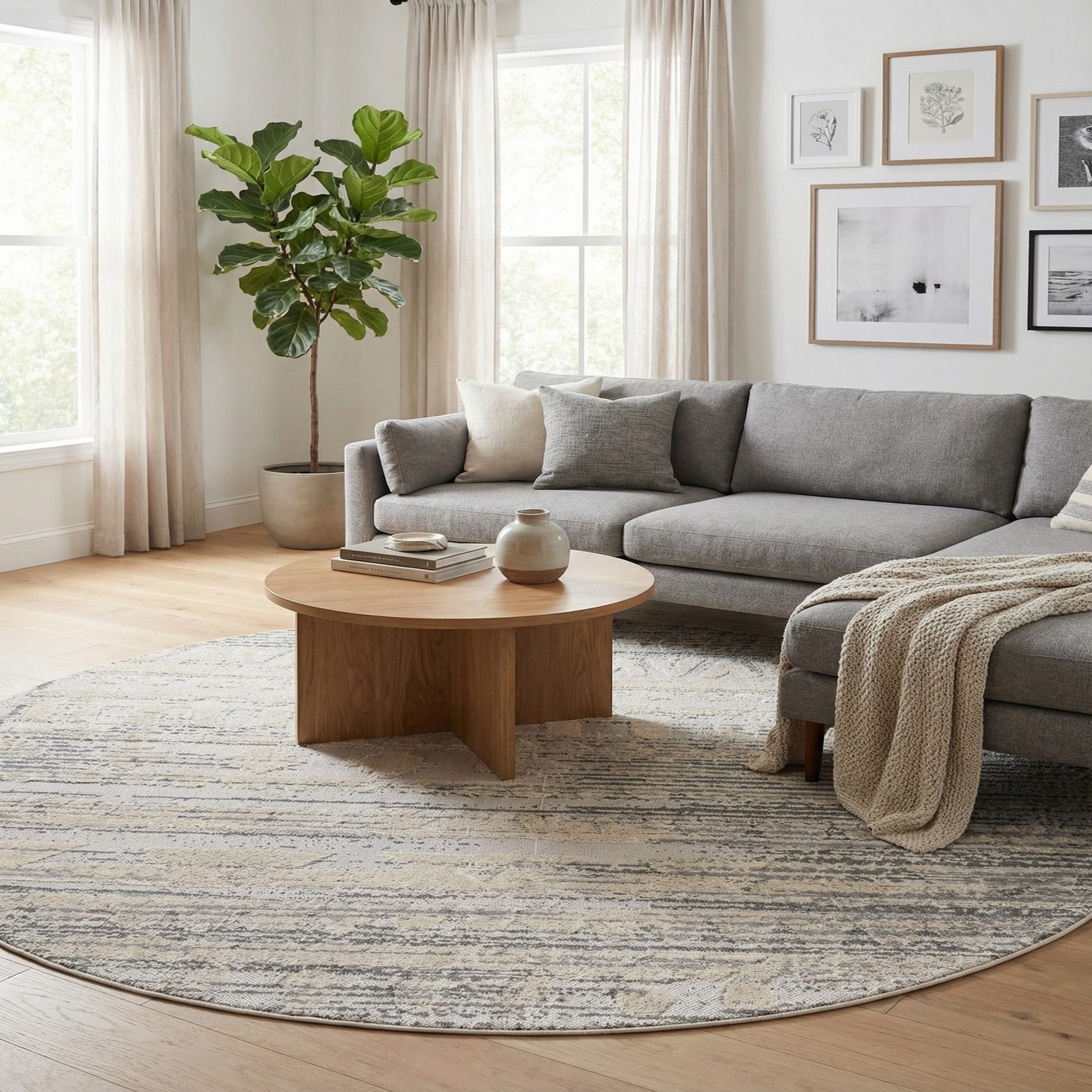 Machine-made from 100% polypropylene, this round rug has a low-profile, slightly textured surface with subtle raised motifs you can feel underfoot. The sandy beige background sets a warm, neutral foundation while beige and gray form a layered pattern of distressed linear striations and soft geometric bands. The result is a lived-in, textural look that adds depth without heavy visual weight.