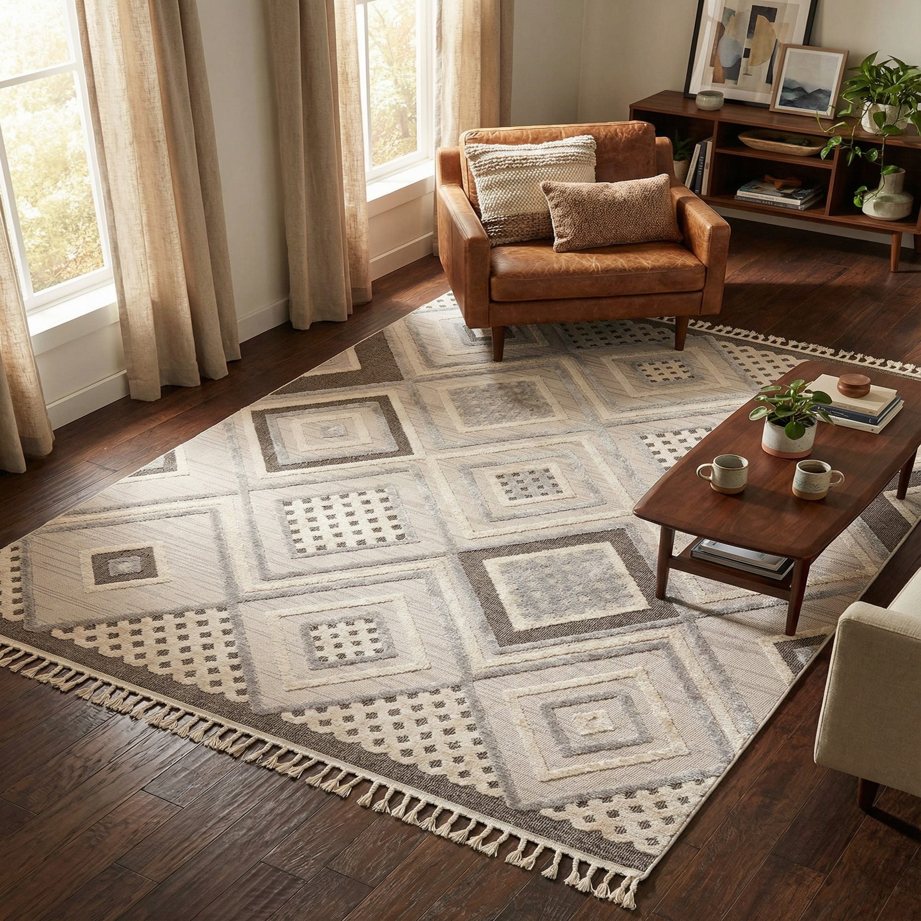 A soft Sandy Beige field provides a warm, neutral backdrop for a crisp geometric composition of concentric diamonds, small lattice dots and alternating outlined and filled motifs. Layers of Beige, Gray and Black create depth within each diamond, and the subtle fringe at the ends adds a casual, hand-finished touch. The repeating geometry gives a structured, contemporary look that stays visually light thanks to the sandy base.