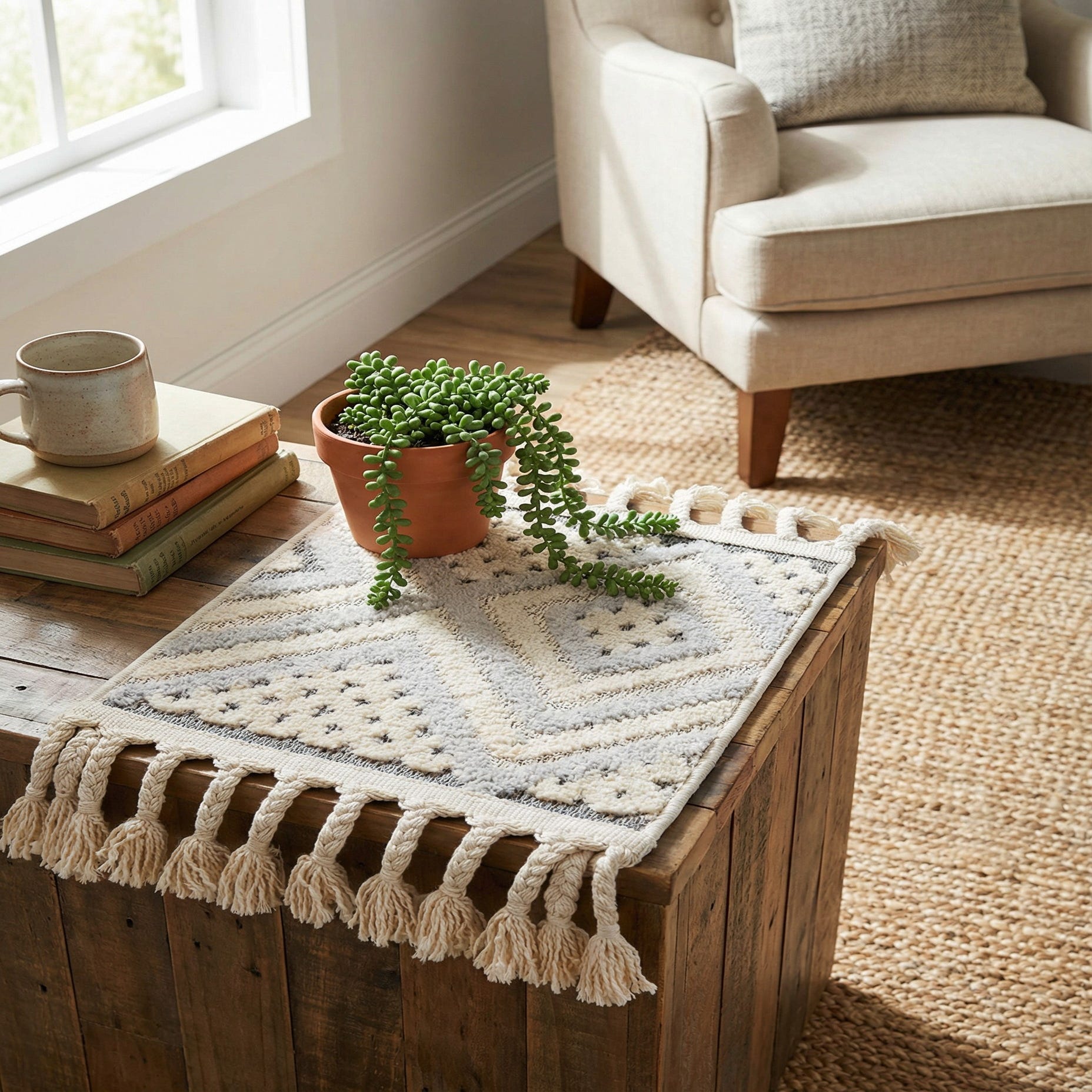 Soft, raised diamond motifs and delicate stitched dots create a relaxed, bohemian-inspired pattern on a sandy beige background. Layers of beige and gray pile form chevron-like bands and concentric diamonds, while small black crosses add subtle contrast and definition. The surface combines a plush, tufted texture with lower, looped accents for a tactile, dimensional feel, and braided fringe and knotted tassels finish the ends for a handcrafted look. Machine made from 100% polypropylene, this piece is a Sample.