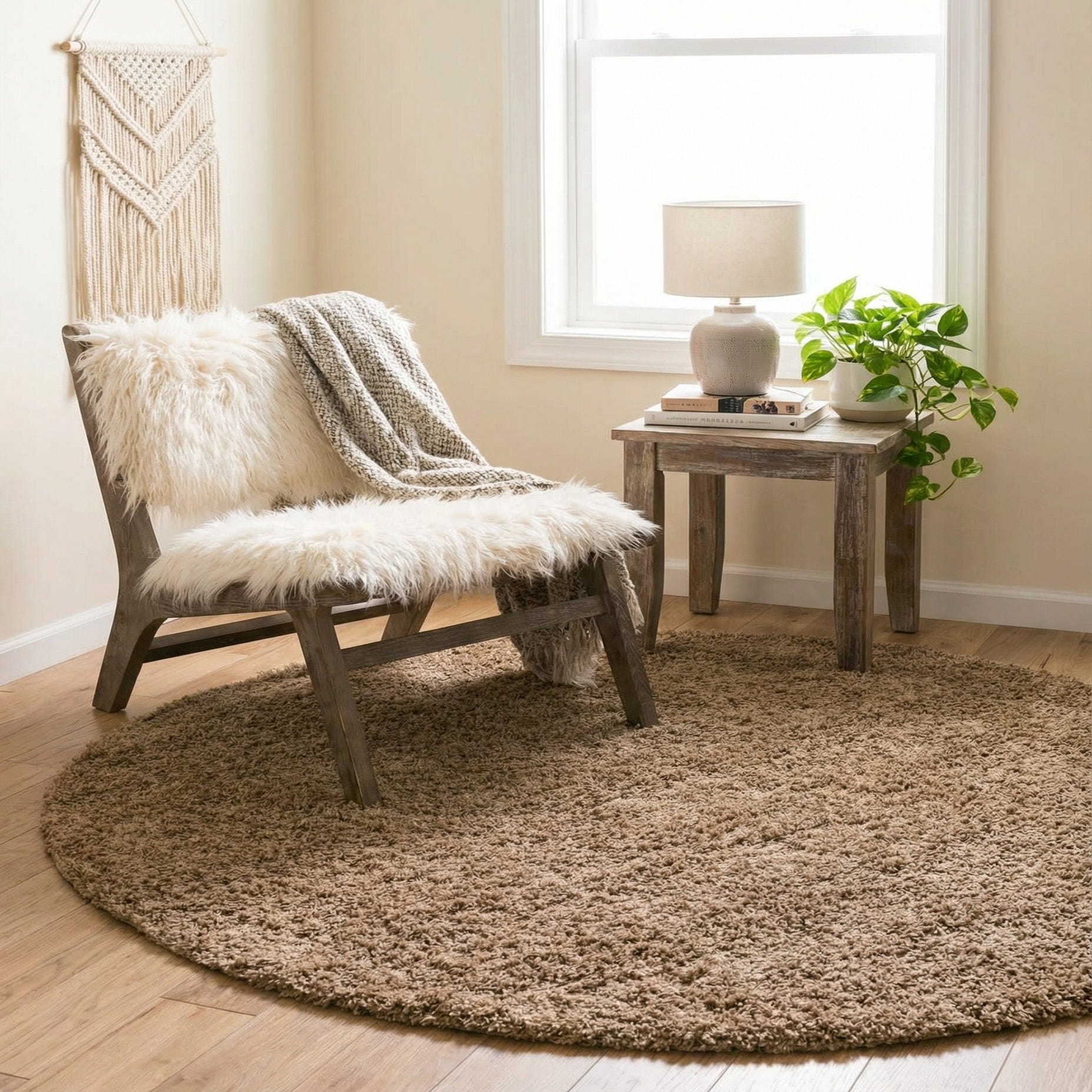 A 4' round brown shag rug with a plush, textured pile, ideal for adding warmth to any indoor space.