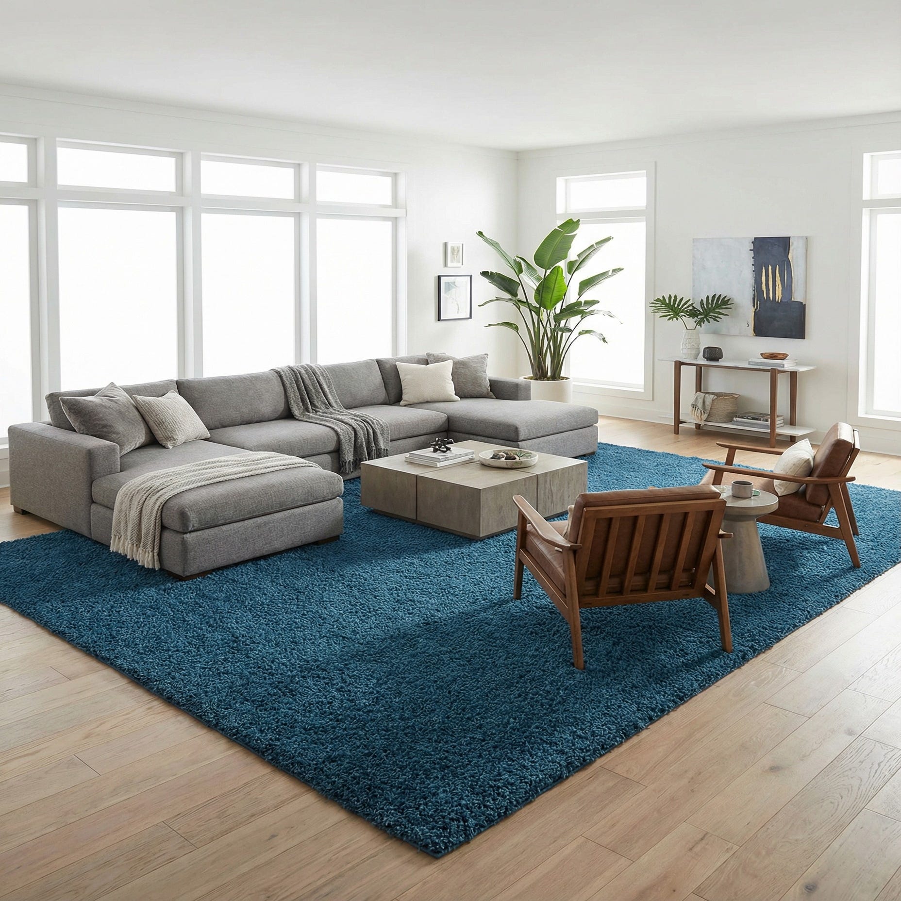This rug works well wherever you want to introduce rich color and a cozy underfoot feel: anchor a living room seating area, add warmth beside a bed, or create a comfortable media room floor. Pair it with light neutral upholstery to let the sapphire color stand out, combine it with warm wood furniture to balance the depth, or use it in contemporary and transitional interiors where texture and color carry the scheme.