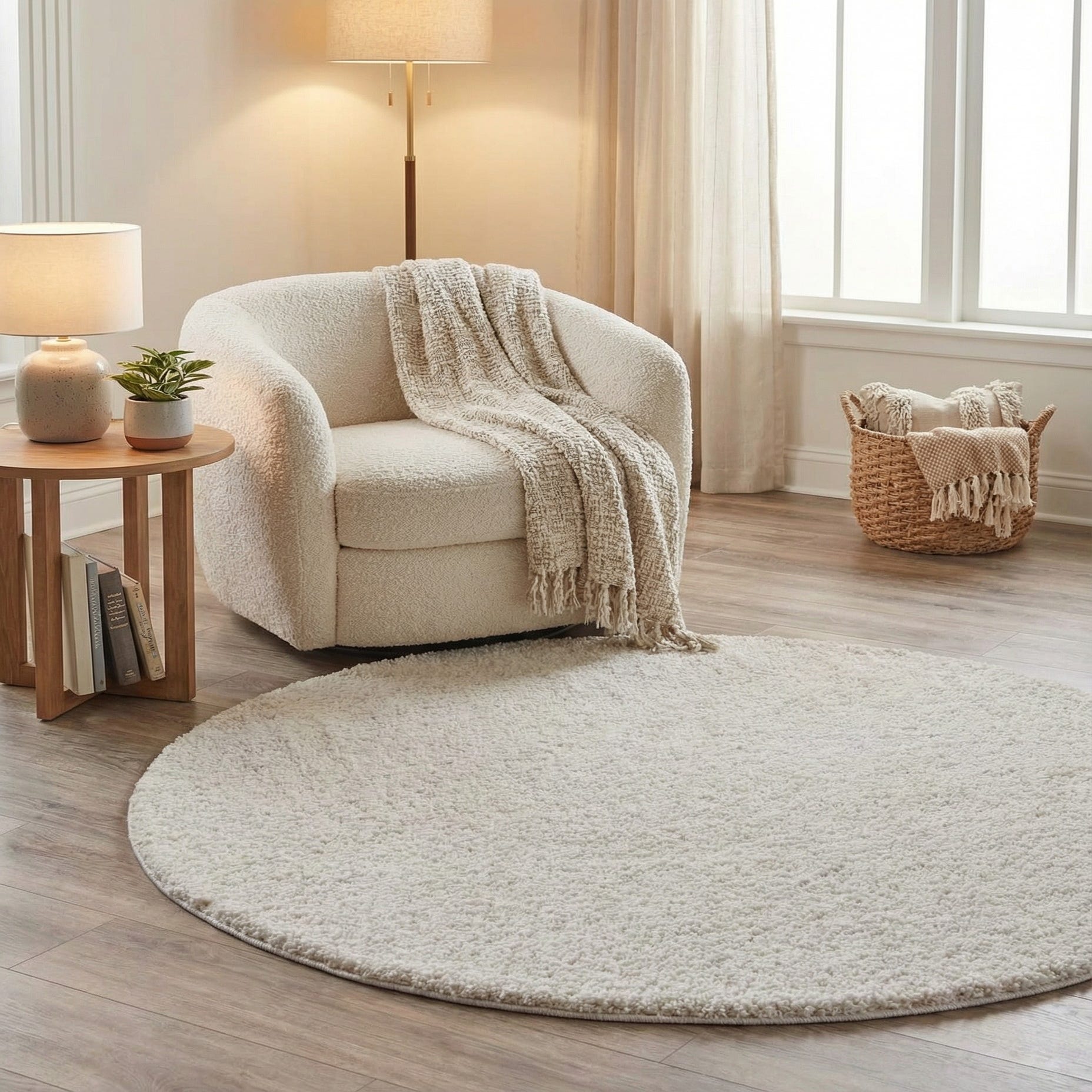 The simple, contemporary profile pairs easily with a variety of interiors — place it under a small round coffee table in a cozy seating area, soften a bedside vignette, or add warmth to a nursery or reading nook. It complements Scandinavian and coastal palettes, light wood furnishings, and muted metallic accents, and works well when layered over a larger, low-profile rug for added dimension.
