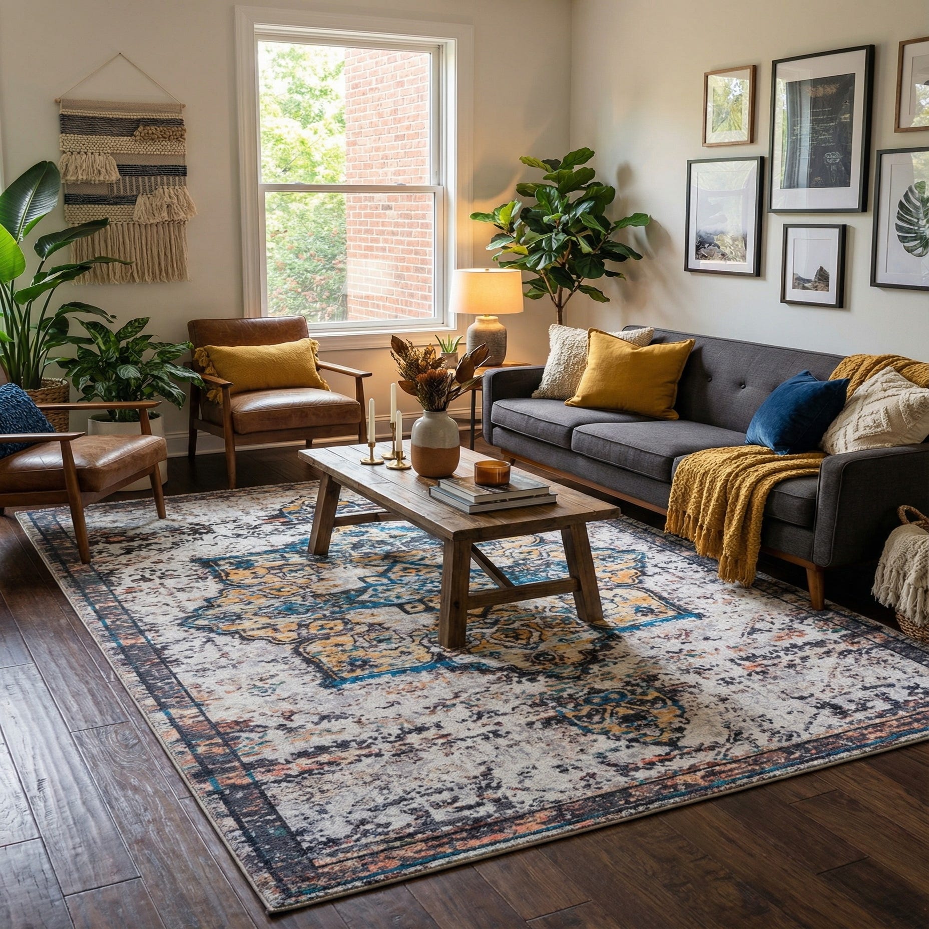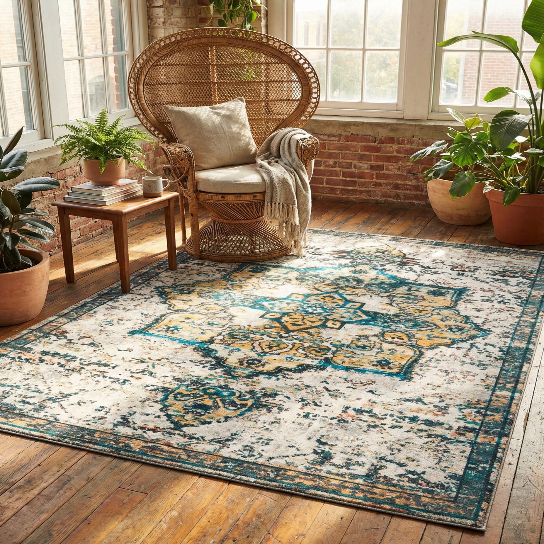 Machine-made from polyester chenille, the surface has a low, velvety pile that feels soft underfoot and offers a gentle, tactile plushness. The construction produces consistent texture and color saturation across the rug, so the medallion and distressed details remain clear even in high-traffic placements. This piece works well anchoring a living room seating group, beneath a rectangular dining table, or layered at the foot of a bed. It pairs nicely with light, coastal palettes, modern farmhouse woods, or eclectic furnishings where pops of blue and warm orange-yellow accents can tie the room together.