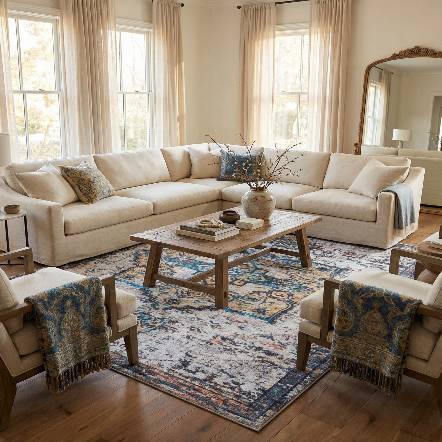 Machine-made in polyester chenille, the surface has a gently velvety hand and low-profile pile that feels soft underfoot while maintaining a smooth, even finish. The color palette and faded detailing make this rug versatile—place it under a living room coffee table to anchor neutral seating, layer it in a light-filled bedroom for a relaxed coastal or modern farmhouse look, or use it in a dining area to introduce pattern without overwhelming the space. It pairs especially well with natural woods, matte black metal accents, and linens in soft neutrals or complementary blues.