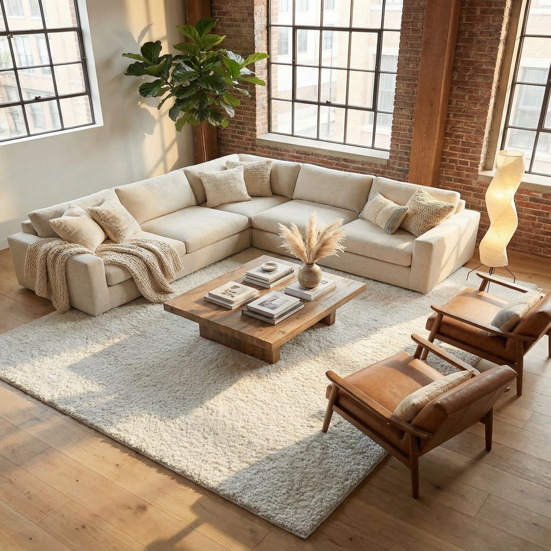 A large 9x12 rectangular ivory shag rug with a plush, textured pile, perfect for a modern living room.