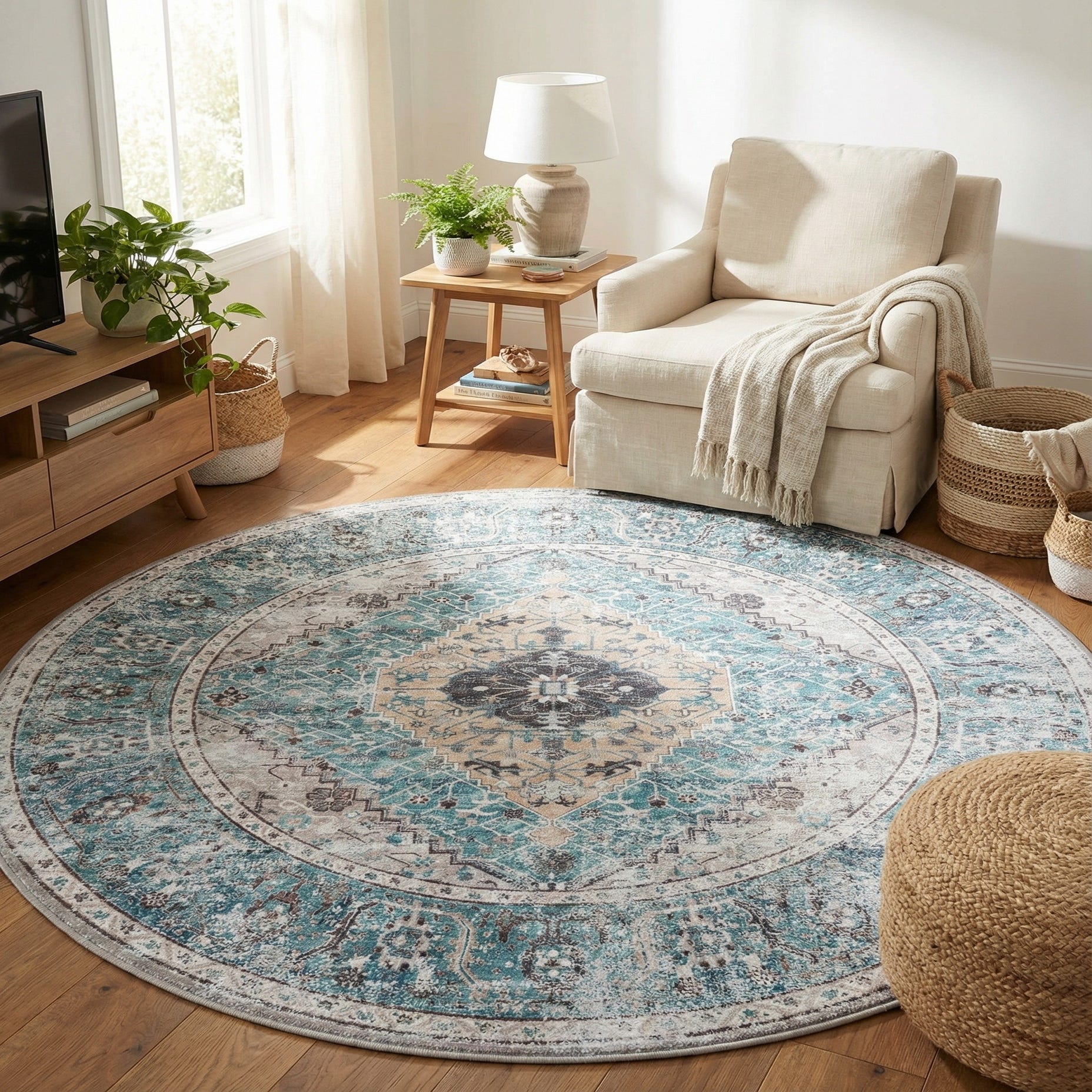 A 6' round Rugs.com Yara rug featuring a distressed blue, green, and beige tribal medallion pattern.