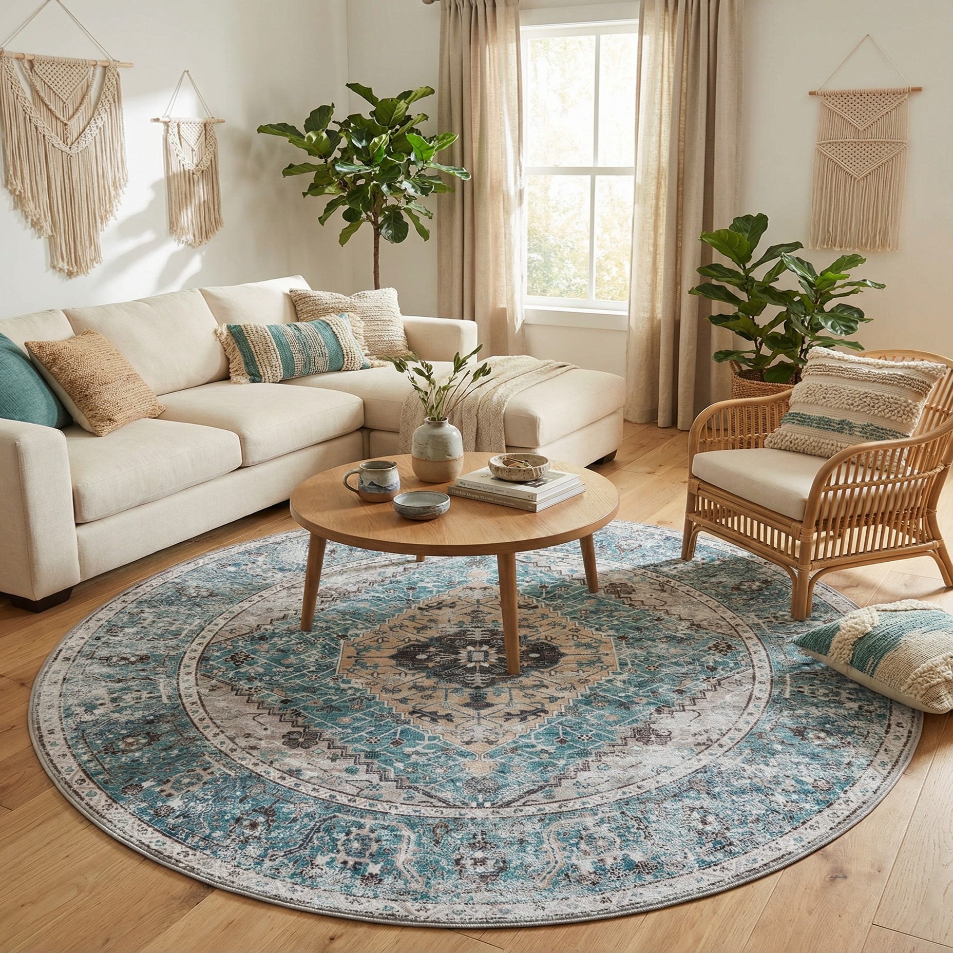 The overall look is a distressed vintage aesthetic that blends traditional Persian-inspired motifs with a relaxed, modern finish. It works well beneath a round dining table or as an anchor for a conversational seating group, and it pairs nicely with coastal, transitional, or casual contemporary interiors. Use it to soften hardwood or tile floors, add color to a neutral bedroom, or introduce pattern into a light, airy living room.