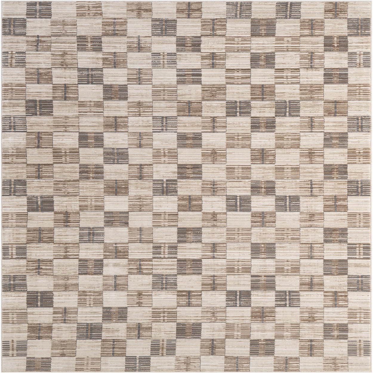 A 5x8 rectangular modern area rug featuring a checkerboard pattern in varying shades of brown, tan, and off-white.