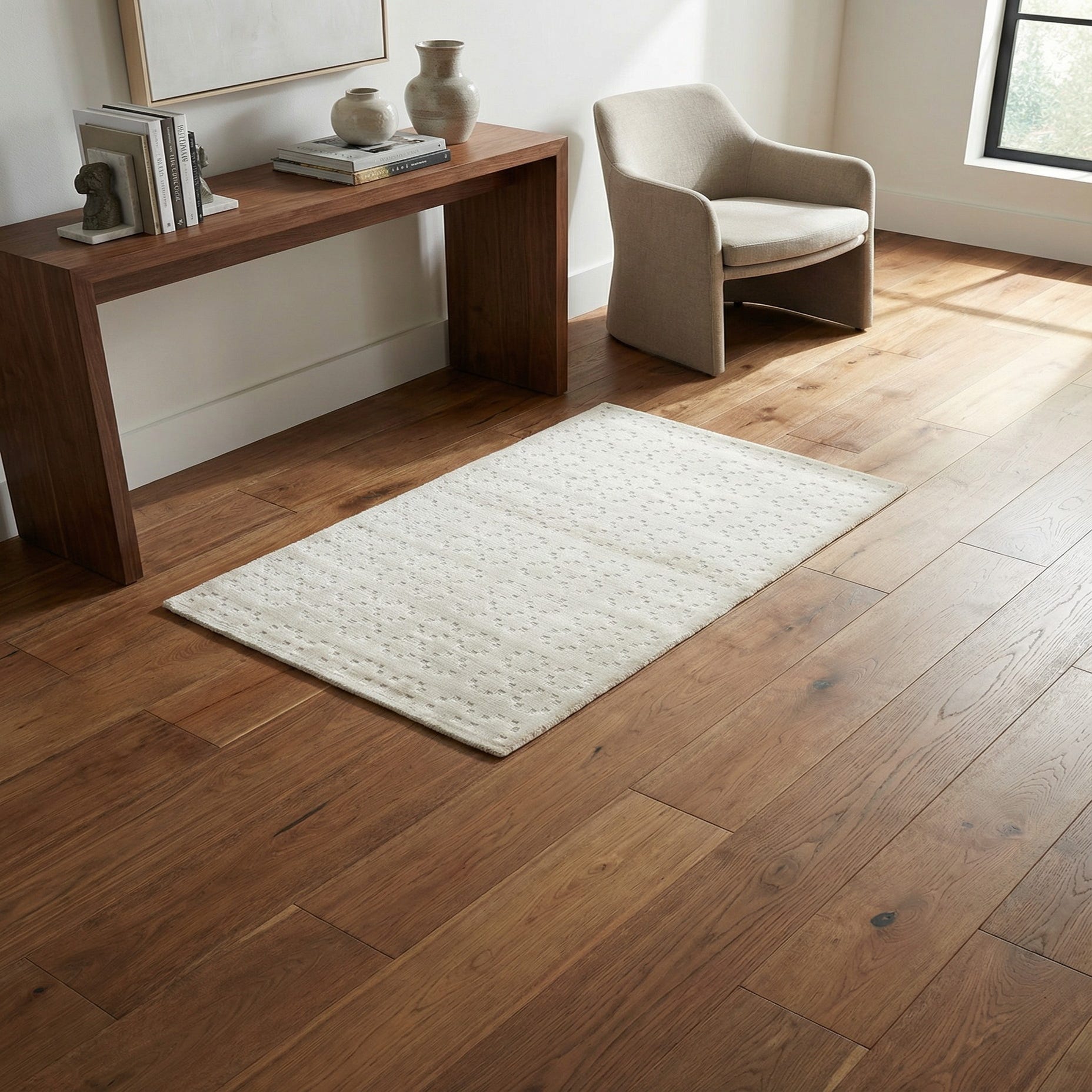With its minimalist pattern and silver hue, this rug would pair exceptionally well with contemporary and modern decor, enhancing spaces that favor clean lines and understated elegance. Additionally, this rug's neutral color palette makes it a versatile choice for transitional interiors that blend traditional and modern elements. It could accentuate a living room, home office, or entryway, complementing furnishings of various color schemes without overwhelming the space.