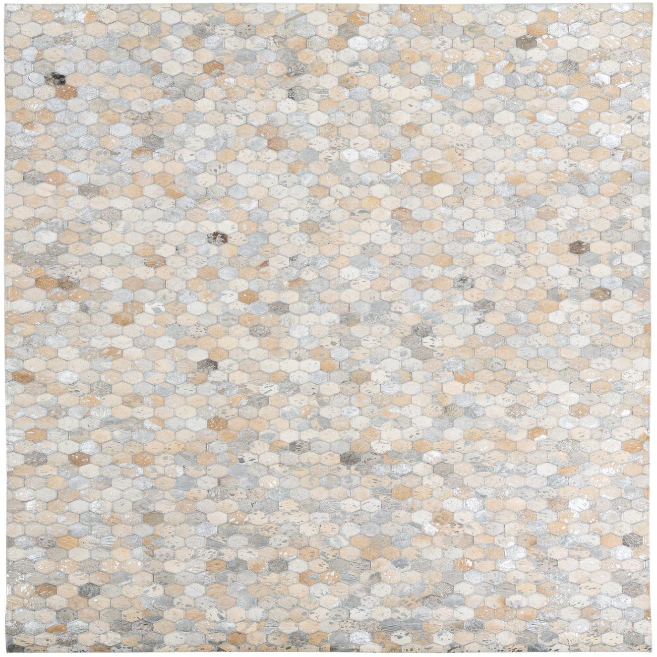 A 5x8 rectangular Cowhide Leather rug featuring a modern, abstract hexagonal pattern in various shades of gray, silver, and beige.
