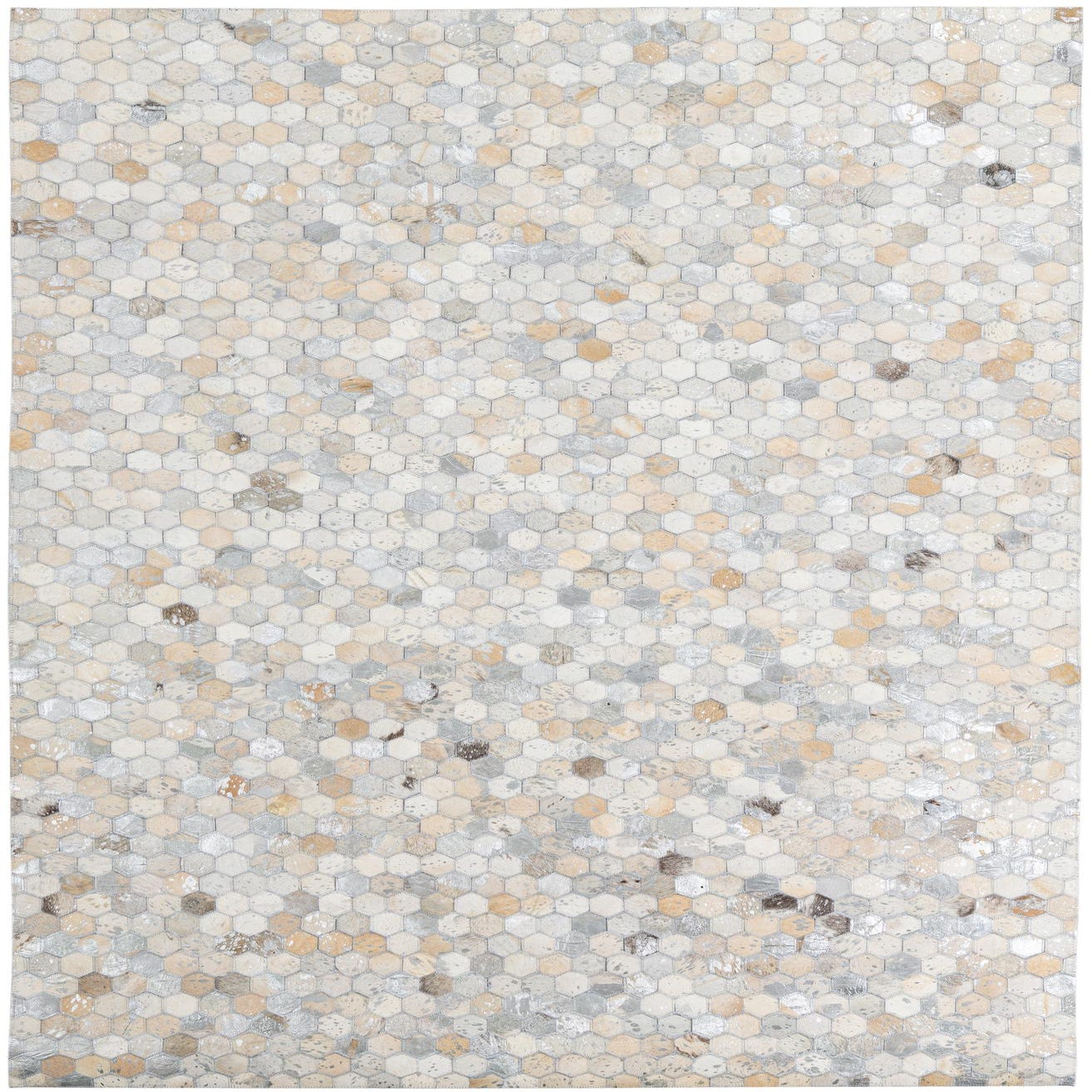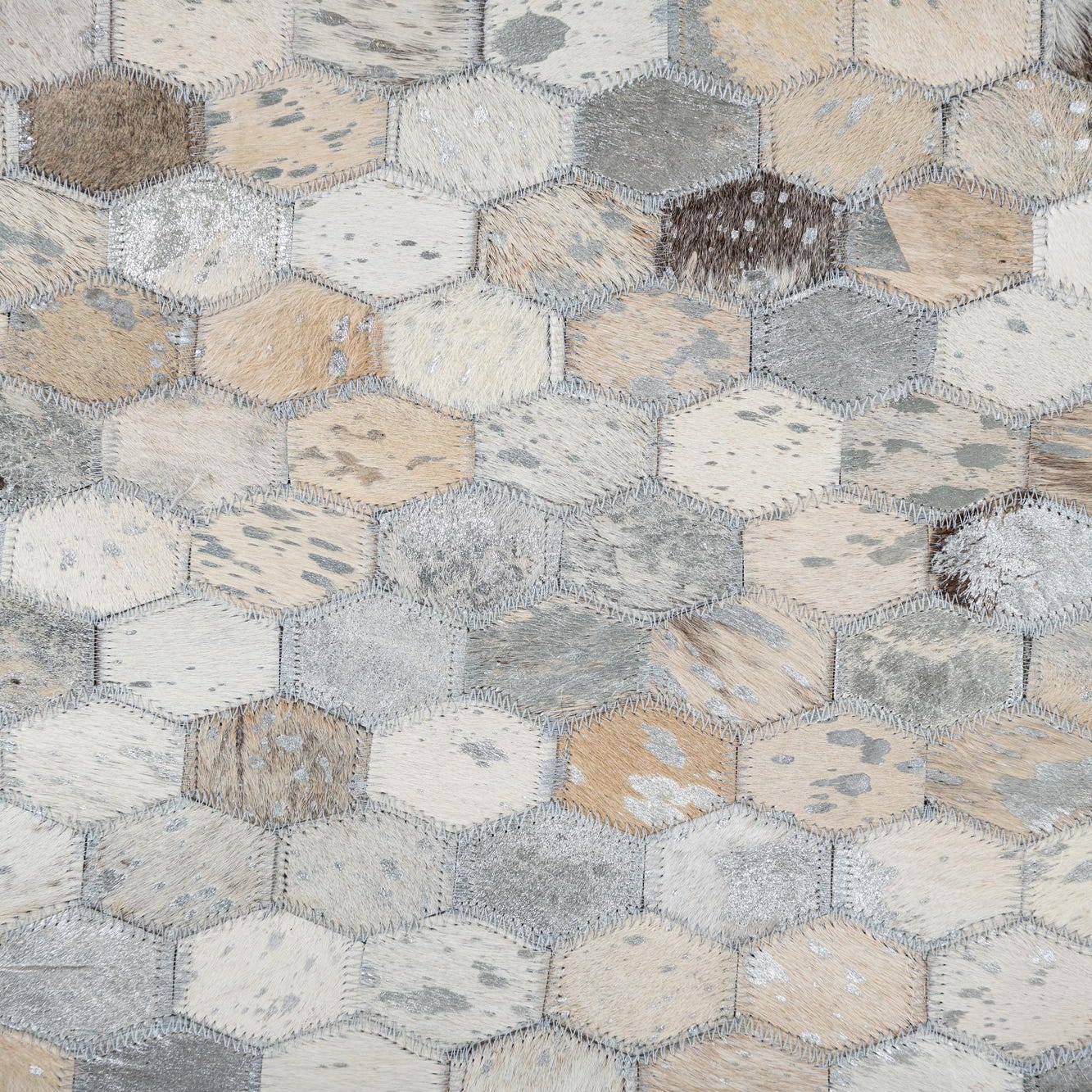 A rectangular 5x8 Cowhide Leather rug featuring a modern, abstract pattern of small hexagonal tiles in varying shades of gray, silver, and beige.