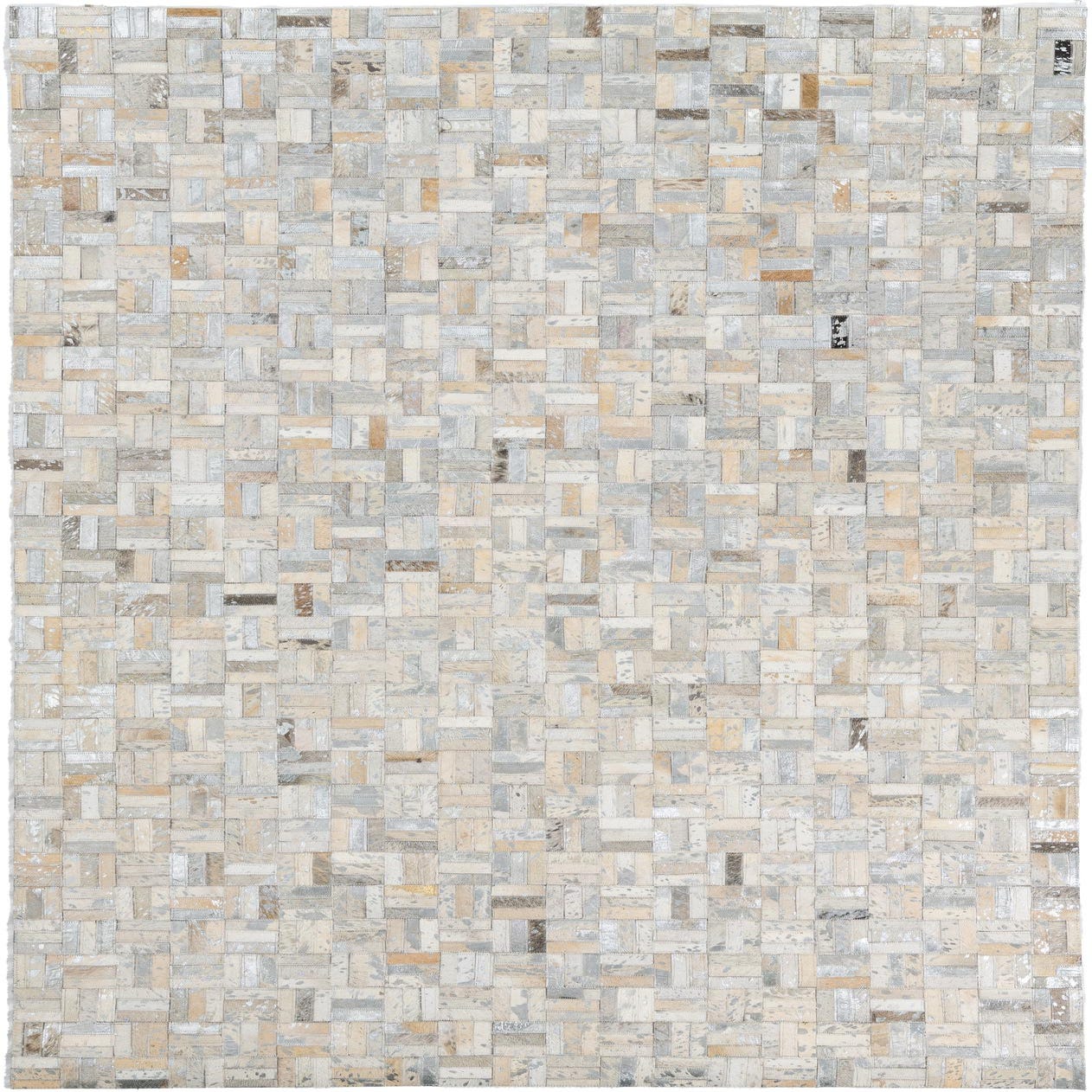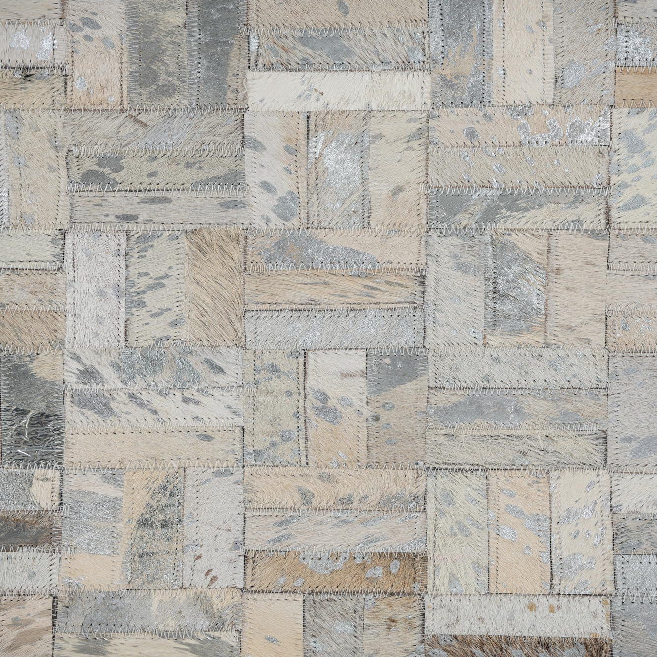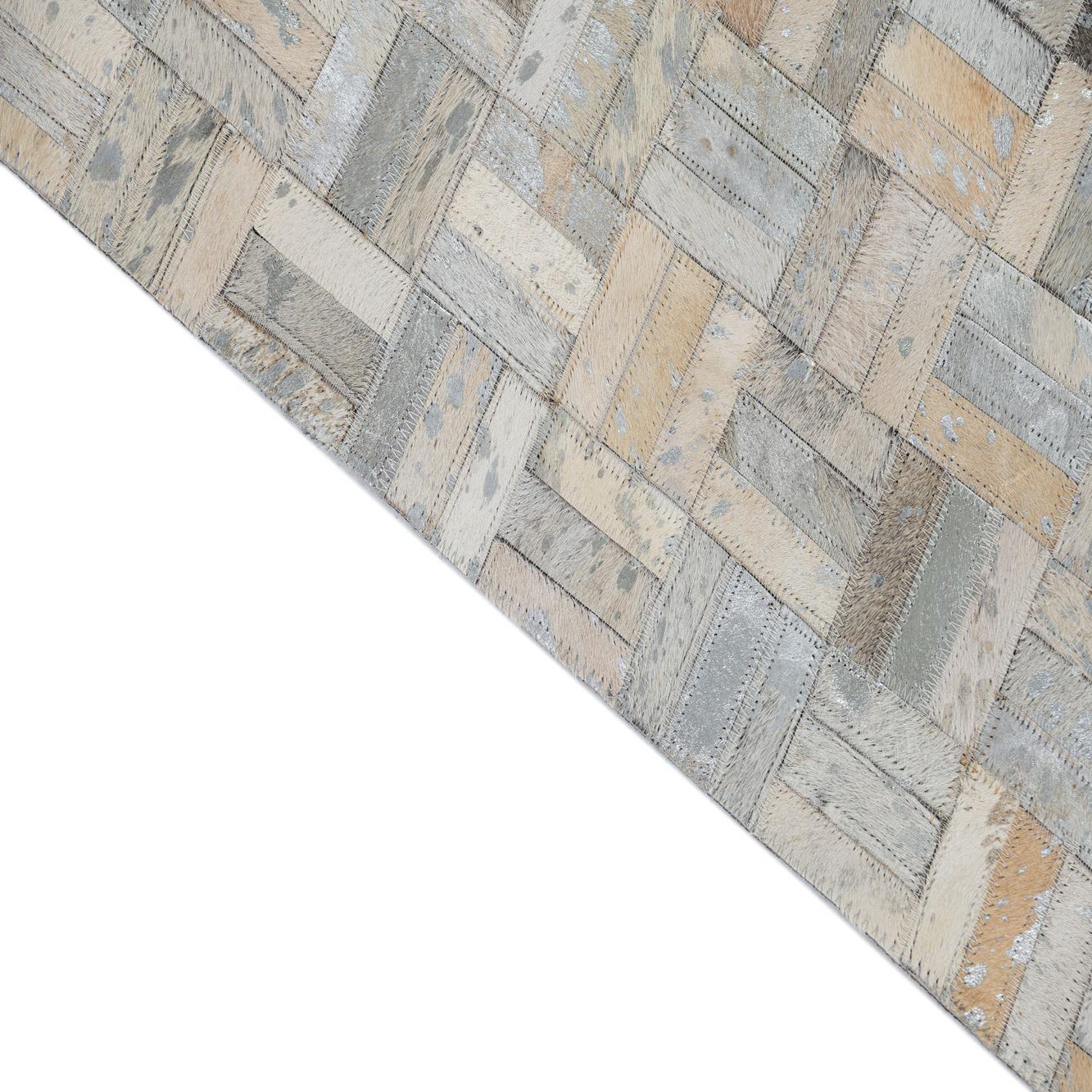 A 5x8 rectangular Cowhide Leather rug featuring a modern patchwork of gray, silver, and tan cowhide pieces.