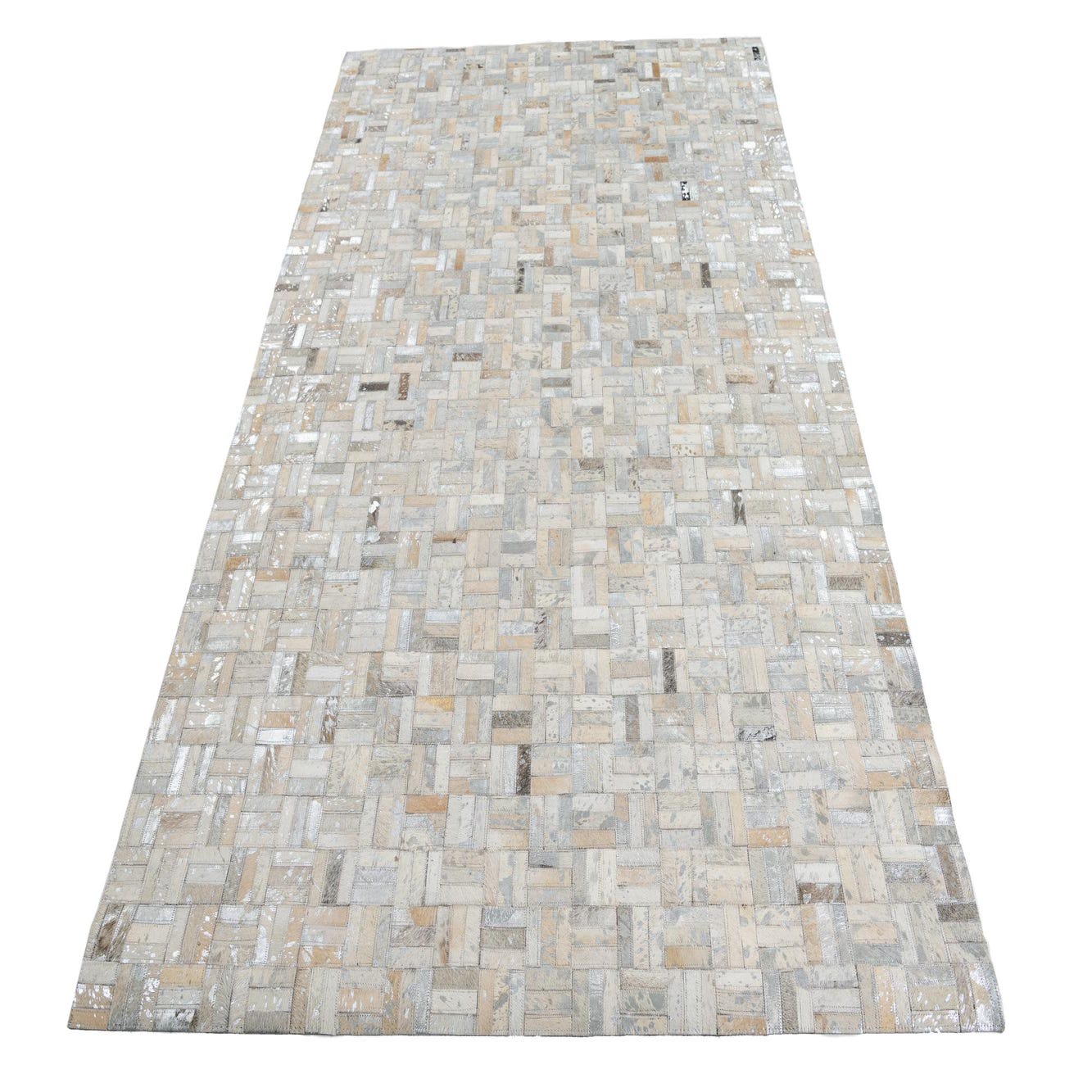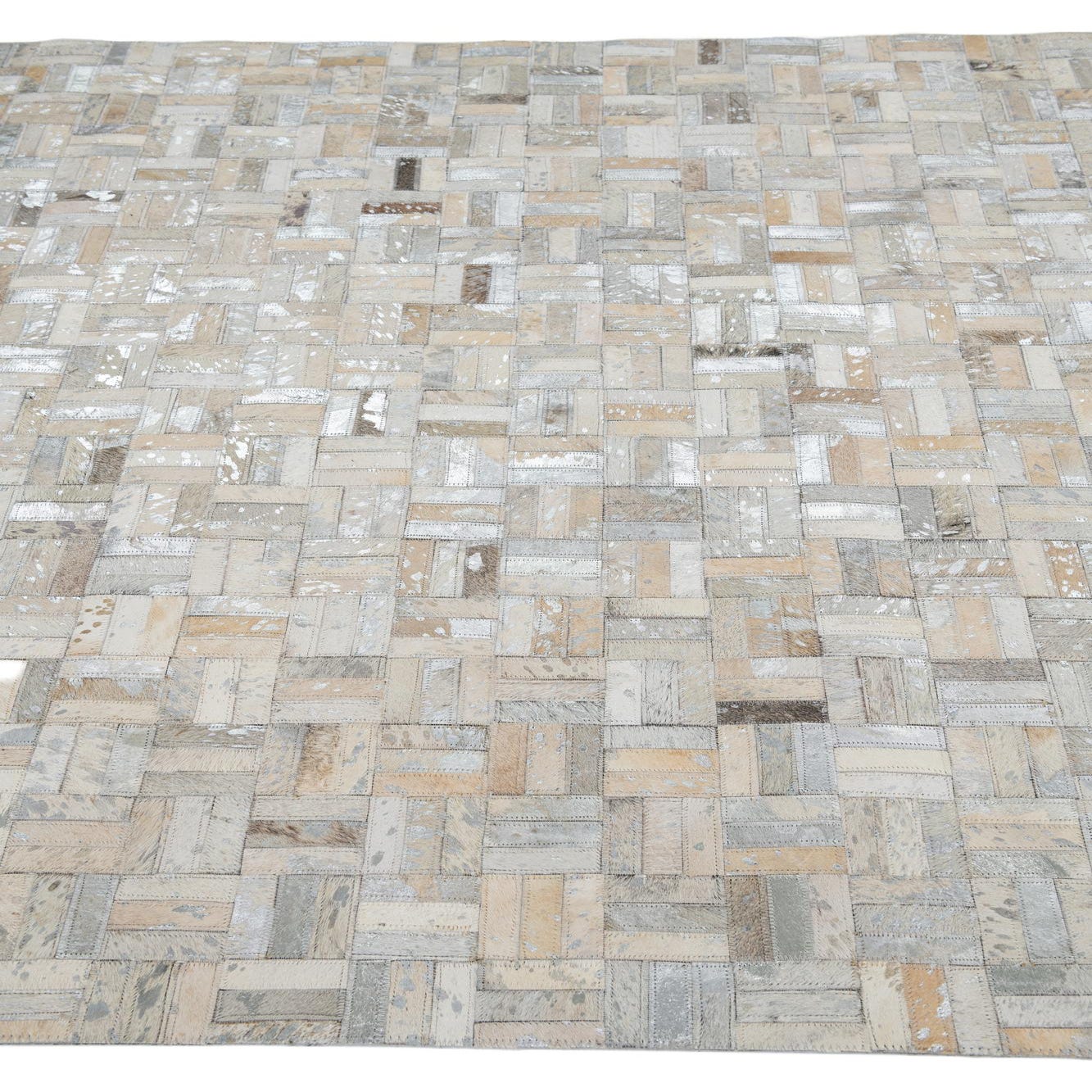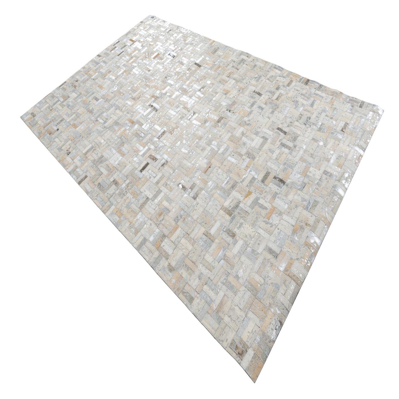 A 5x8 rectangular Cowhide Leather rug featuring a modern patchwork of gray, silver, and tan cowhide pieces.