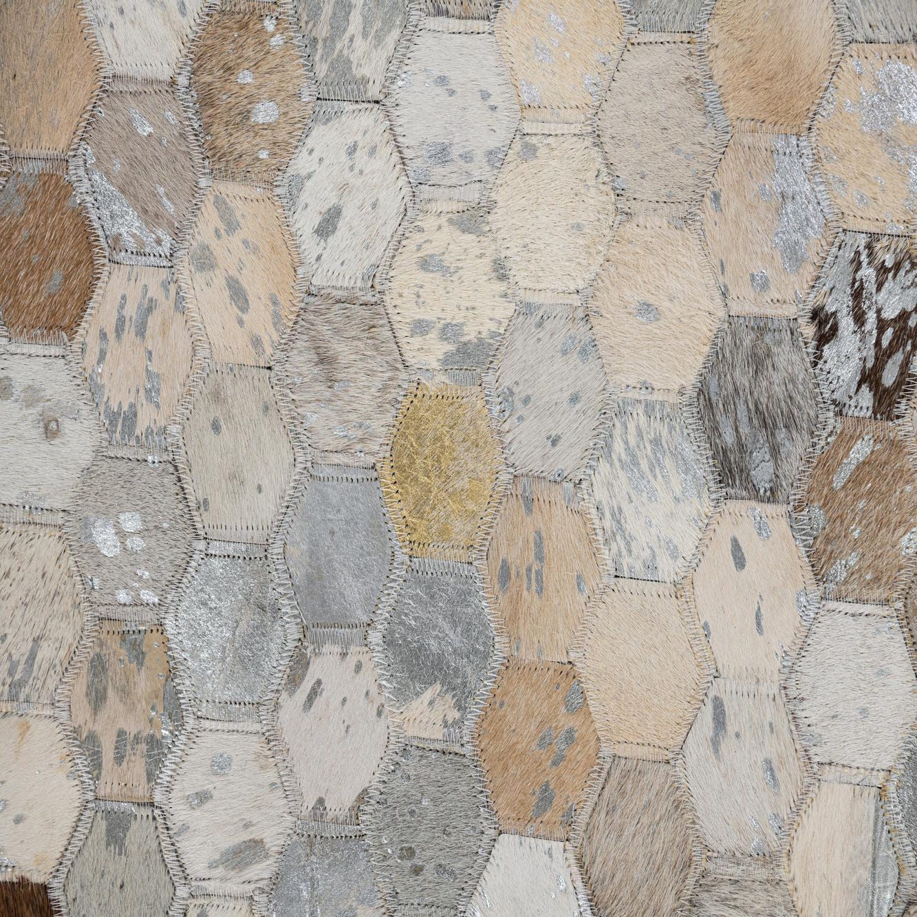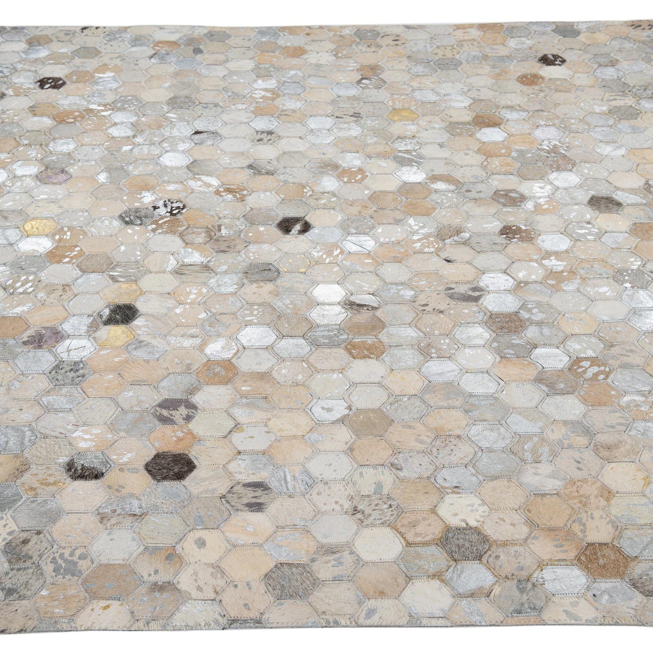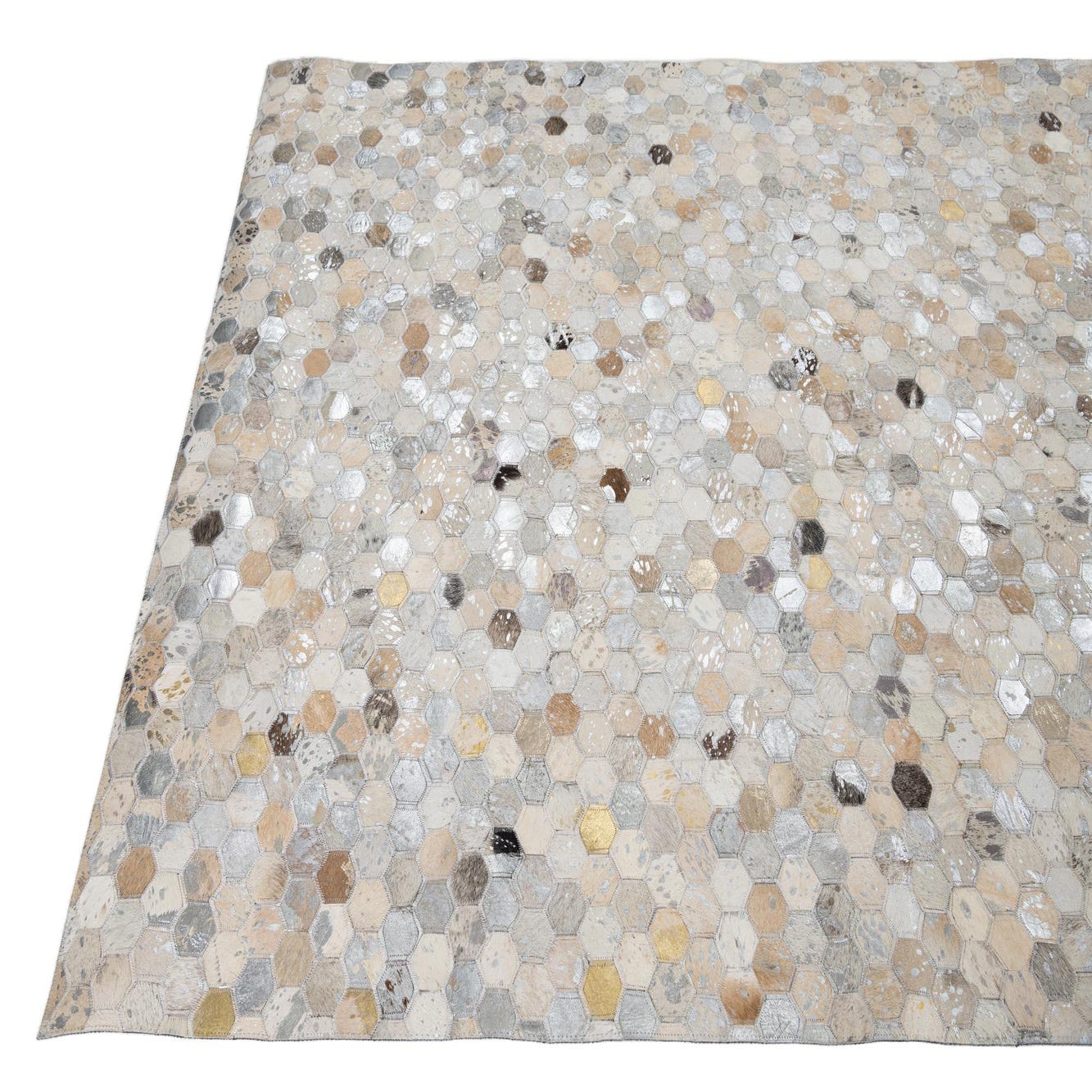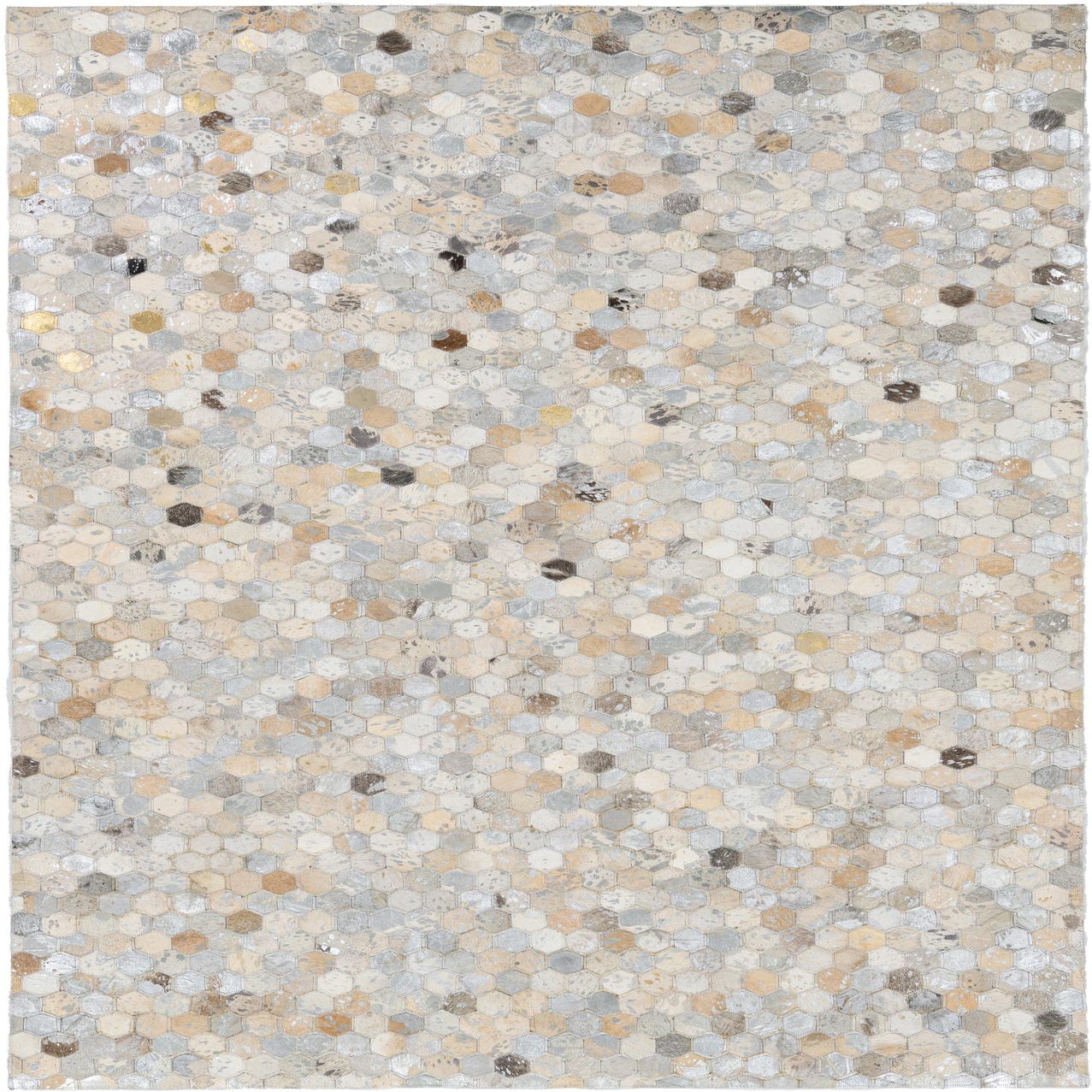 A 5x8 rectangular modern rug made from hexagonal cowhide and leather patches in varying shades of gray, silver, and beige.