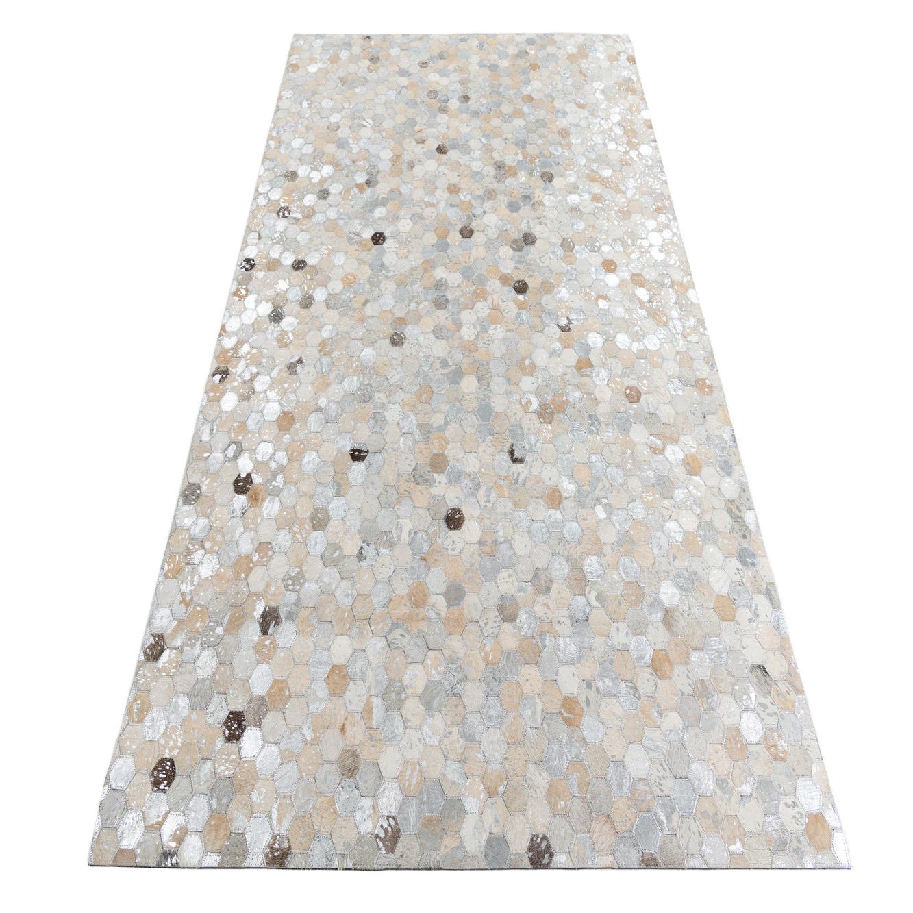 A 5x8 rectangular modern rug made from hexagonal cowhide and leather patches in varying shades of gray, silver, beige, and brown.