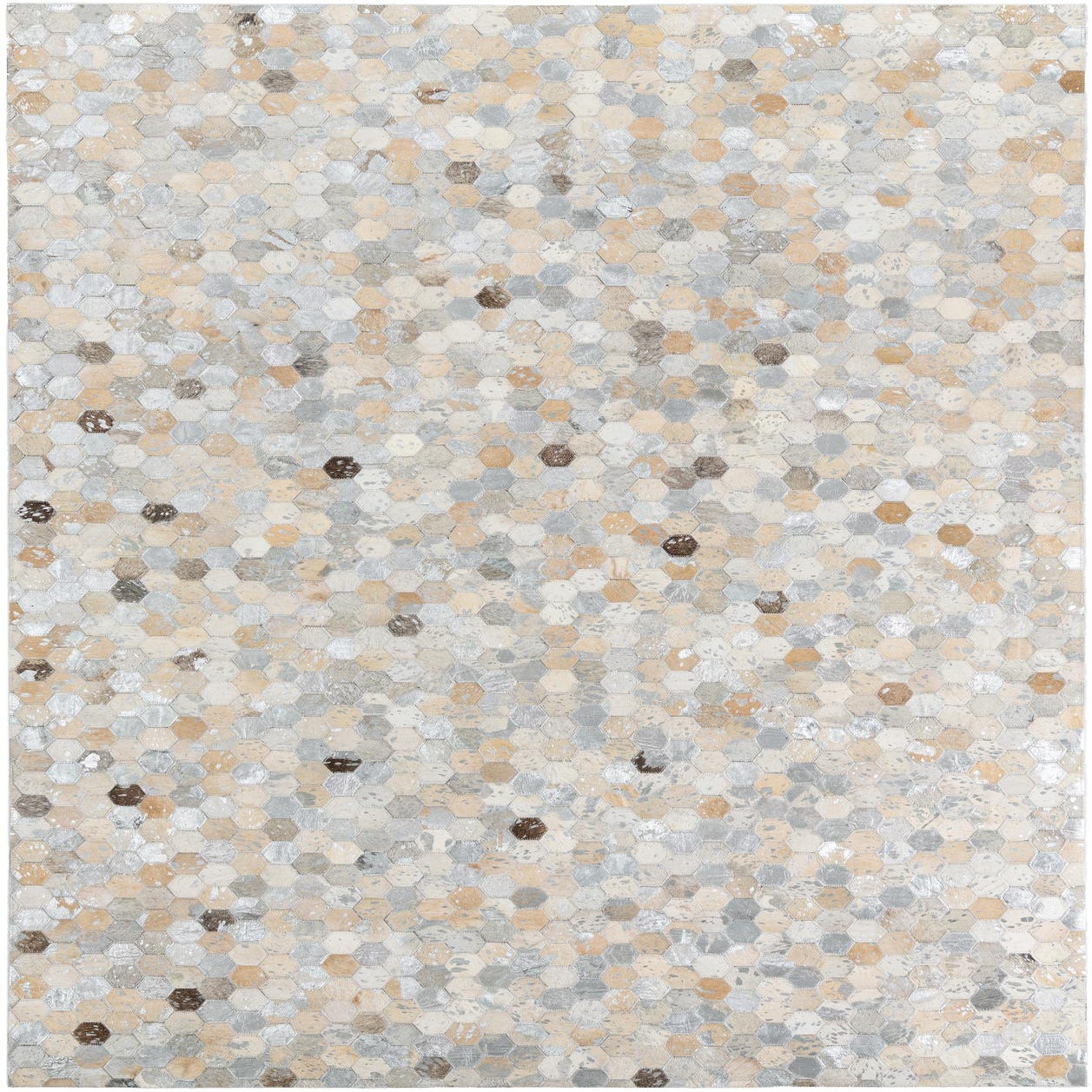 From the Cowhide Leather collection, this hand-crafted 5x8 rug showcases a harmonious blend of luxurious materials, creating a sophisticated aesthetic for contemporary interiors. The rug features an intricate mosaic of cowhide and leather hexagons in a rich array of neutral tones including silver, beige, brown, ivory, gray, and tan, with a silver background that anchors the piece in elegance.