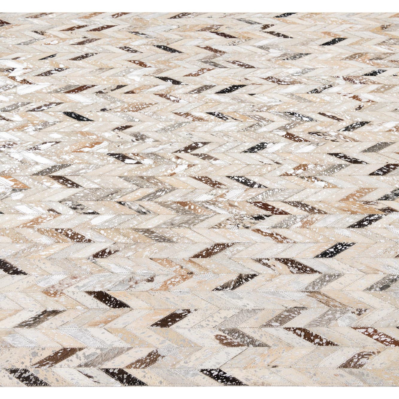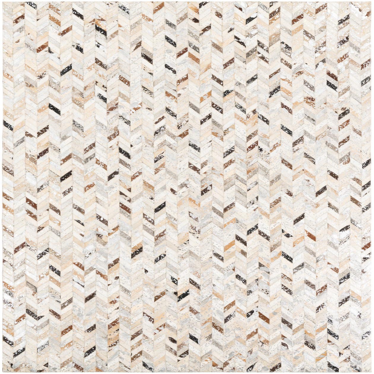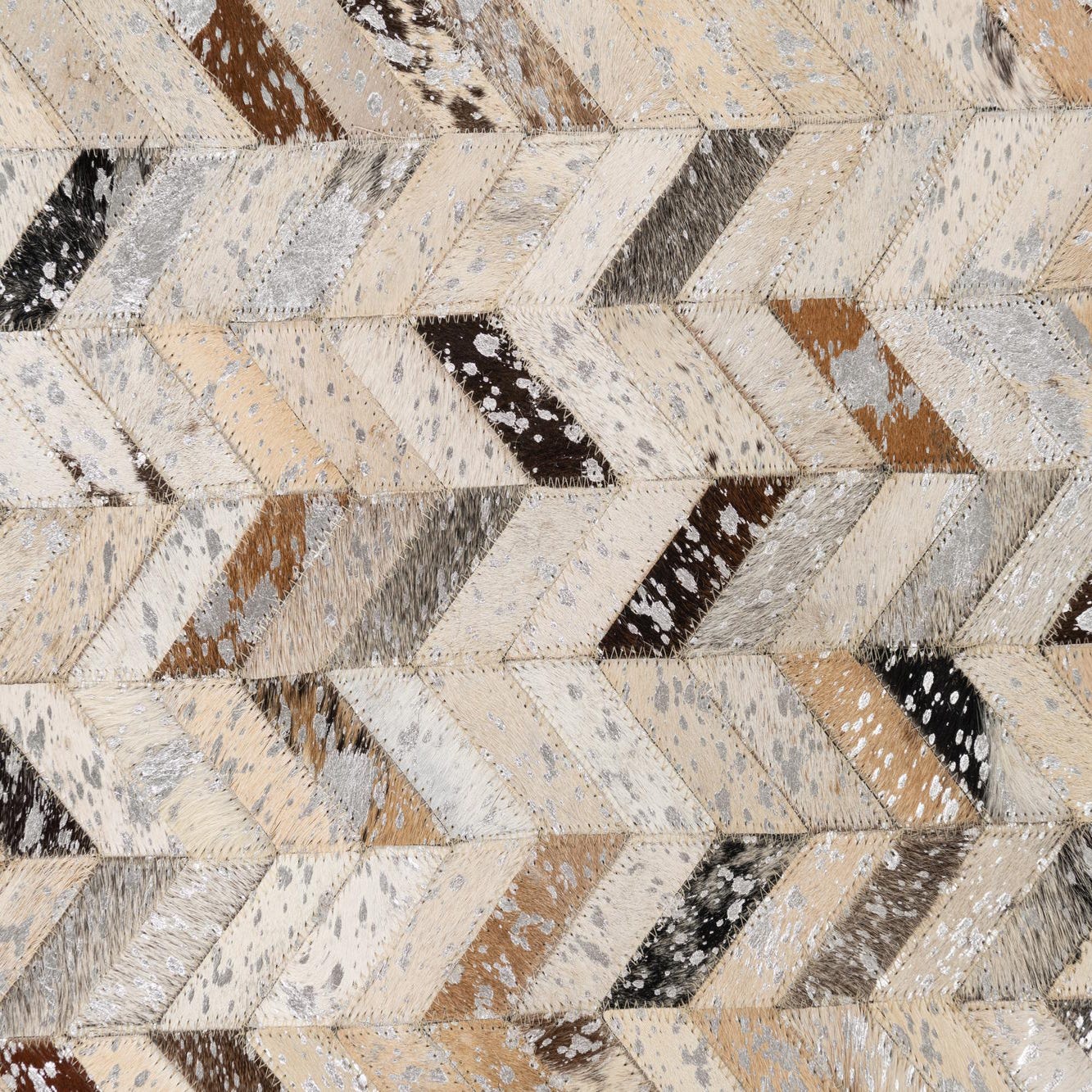 This Cowhide Leather rug presents a modern twist on classic materials, featuring a herringbone pattern that showcases a dynamic array of silver as the dominant background hue, complemented by accents in beige, black, brown, gray, ivory, and light brown. The handcrafted construction of cowhide and leather imparts a unique texture that combines the natural variations and suppleness of the materials with a structured, geometric design.