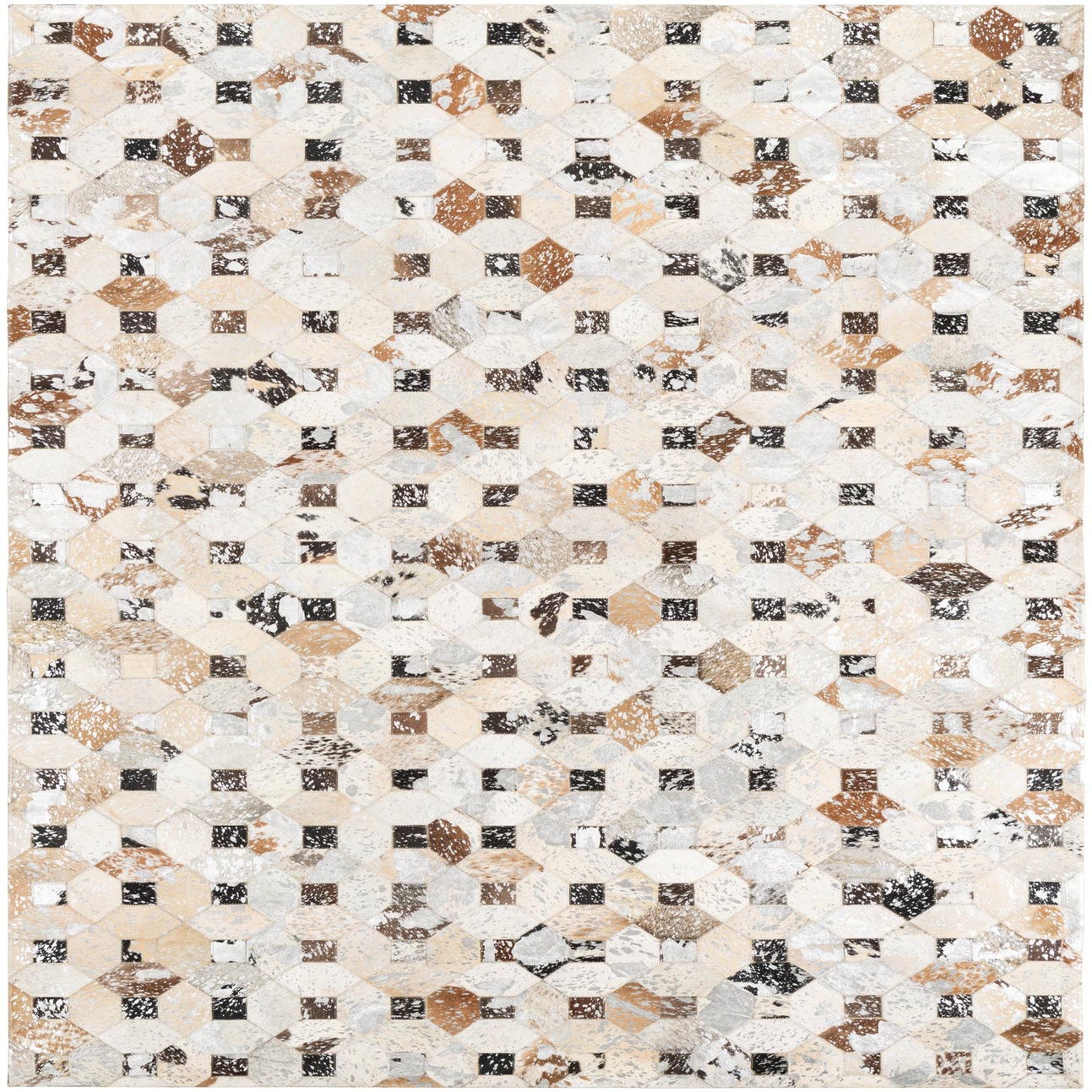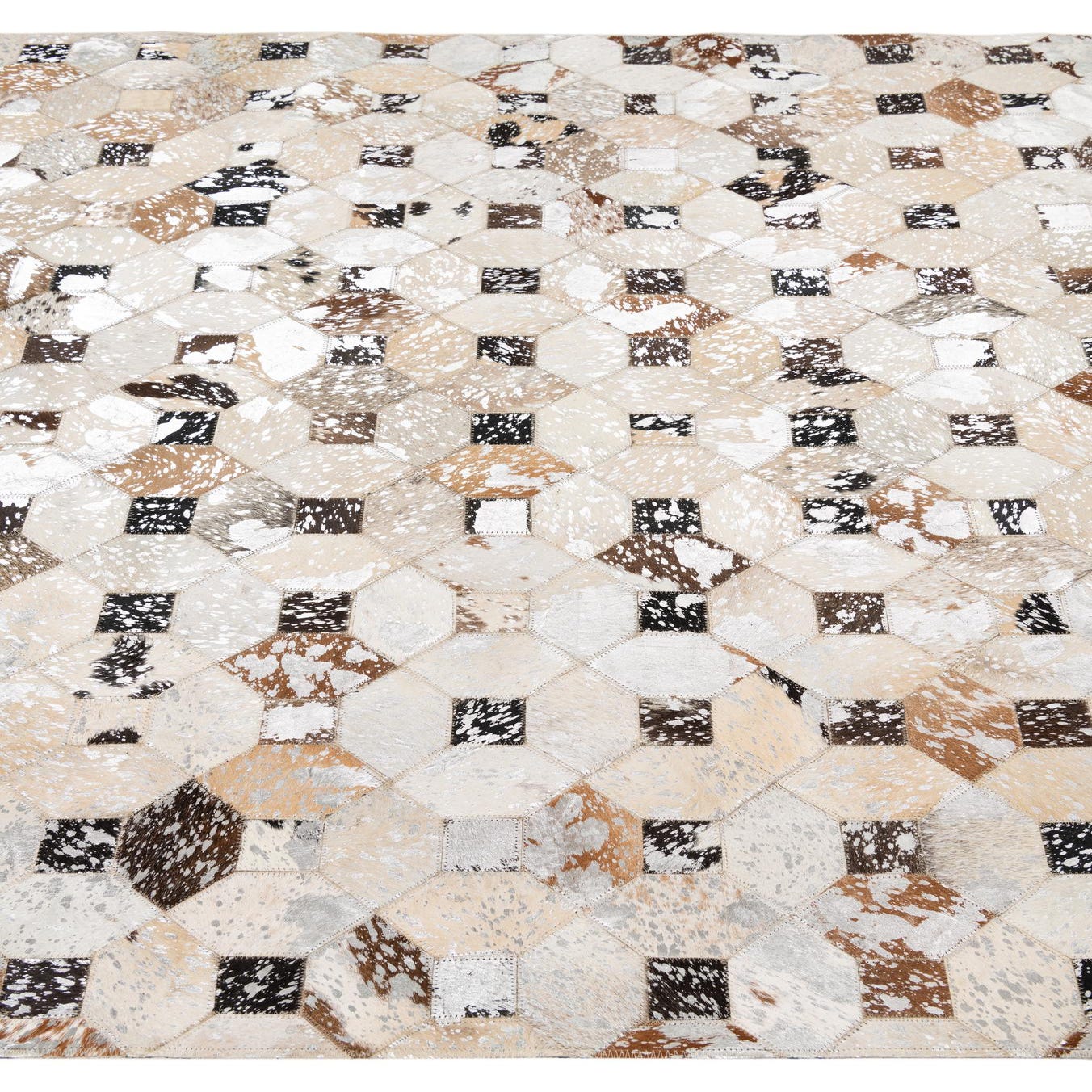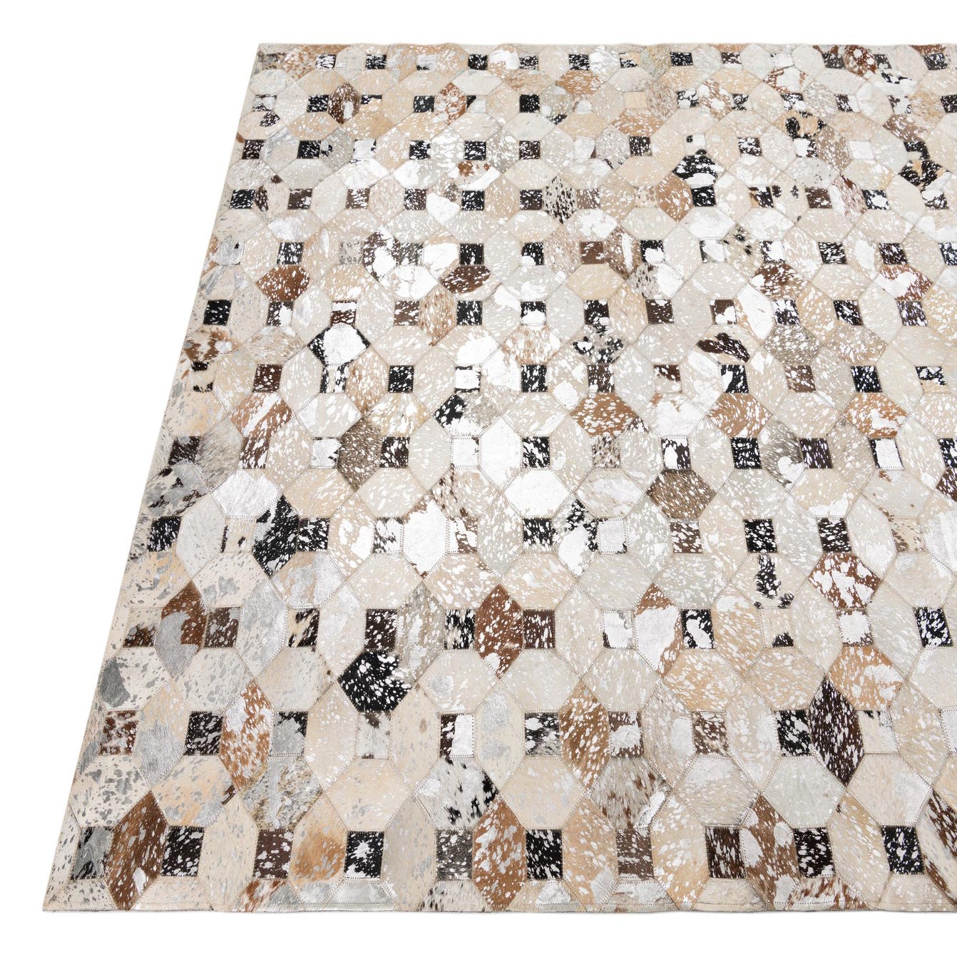 A rectangular 5x8 Cowhide & Leather rug with a geometric pattern of gray, silver, brown, and black patches.