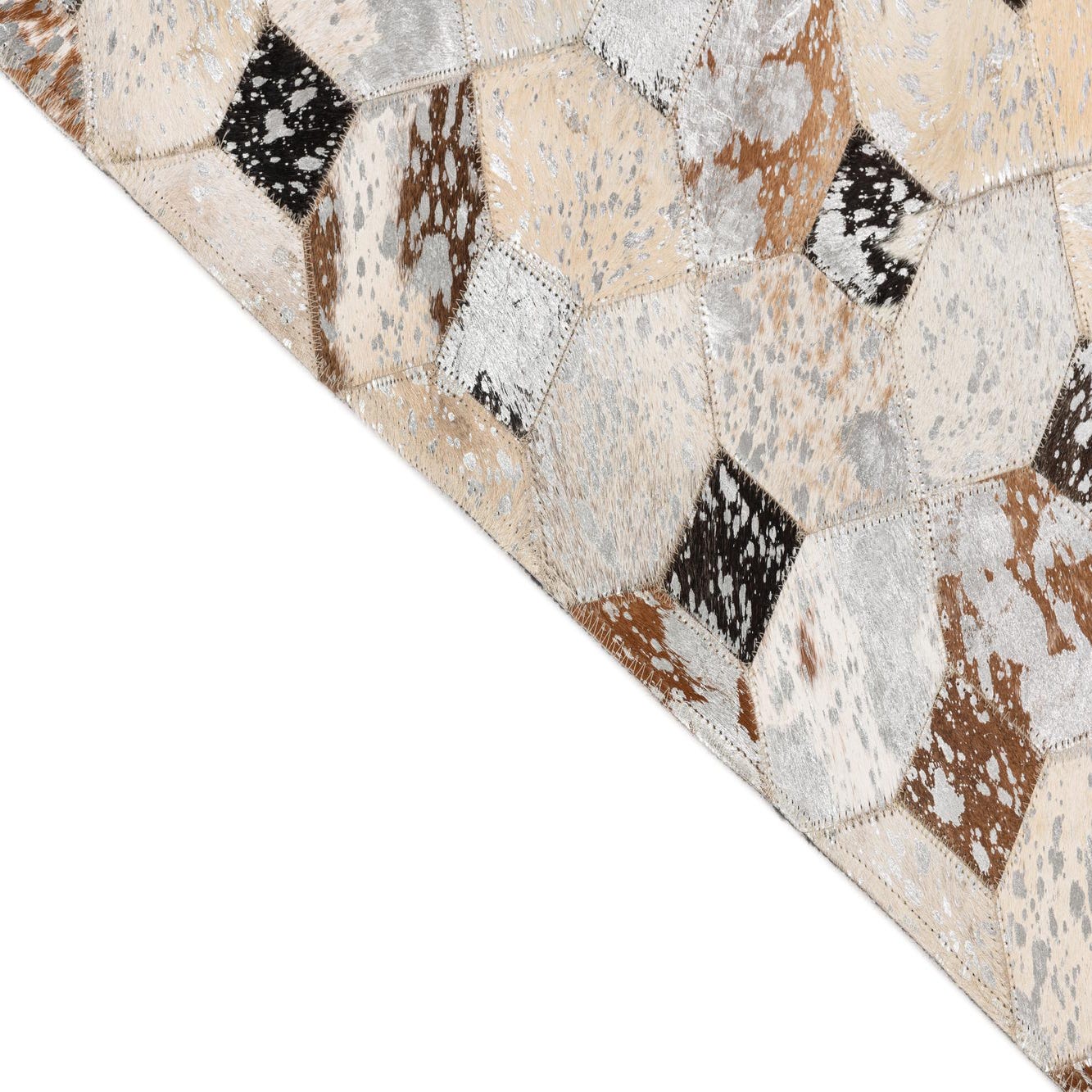The Cowhide Leather Collection presents a 5x8 rug that skillfully marries natural textures with contemporary design. Handmade of authentic cowhide and leather, this rug features a dynamic pattern of polygonal shapes, thoughtfully pieced together to create an intriguing mosaic of tones and textures. The color palette of silver, beige, black, brown, cream, ivory, and light brown gracefully complements the silver background, offering a neutral yet impactful design statement.