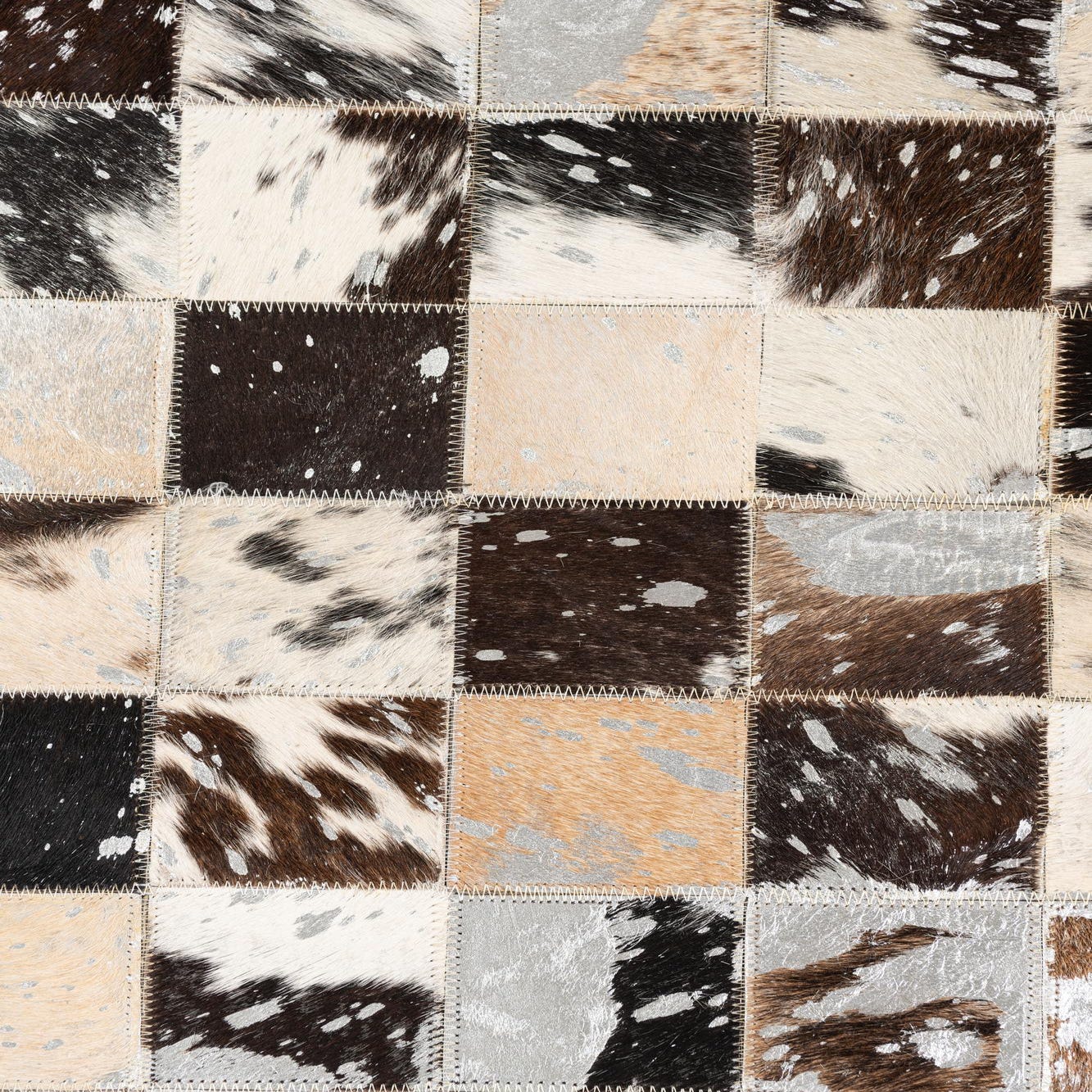 A 5x8 rectangular Cowhide & Leather rug with a modern, abstract patchwork pattern in shades of gray, silver, brown, and white.