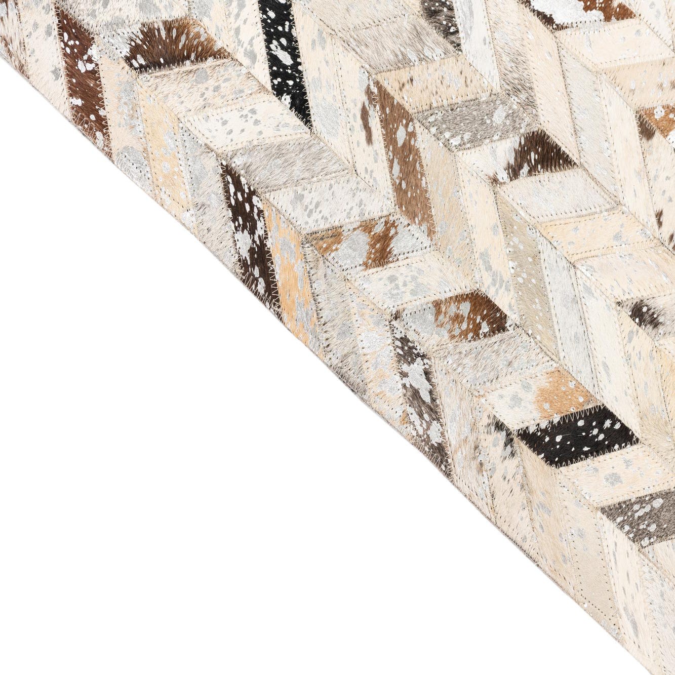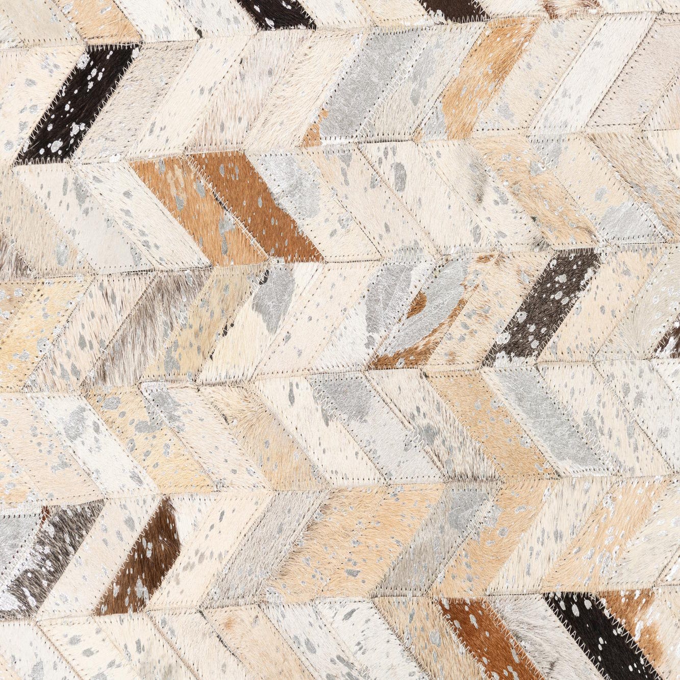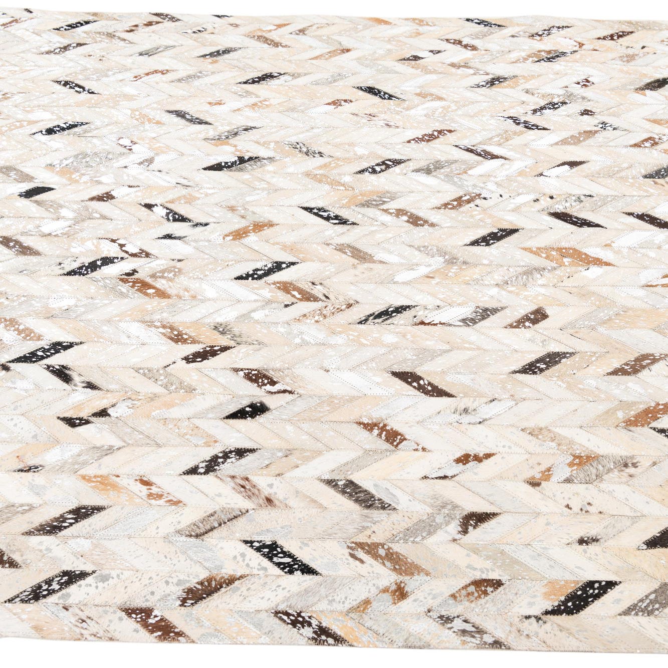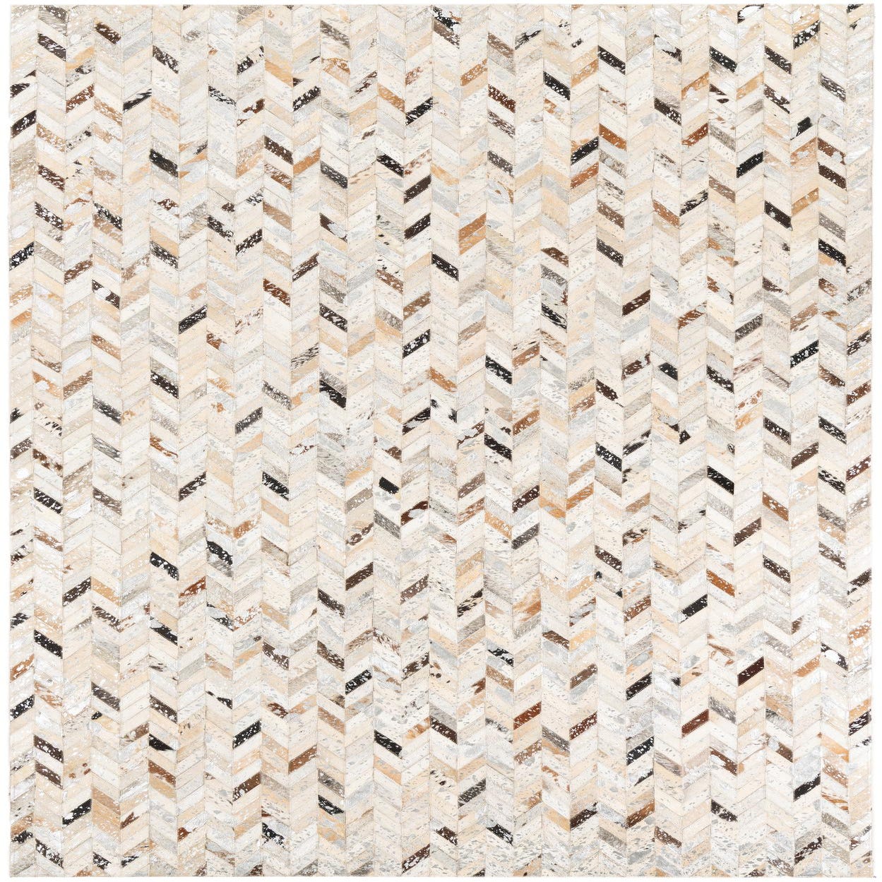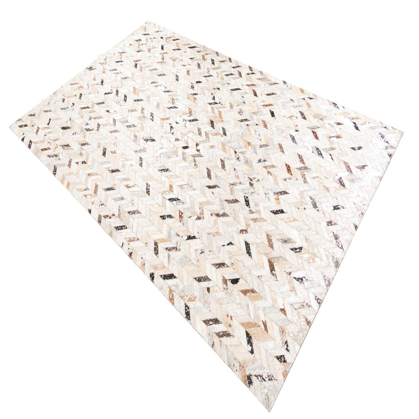 A rectangular 5x8 modern cowhide rug with a chevron pattern in shades of gray, silver, brown, and cream.
