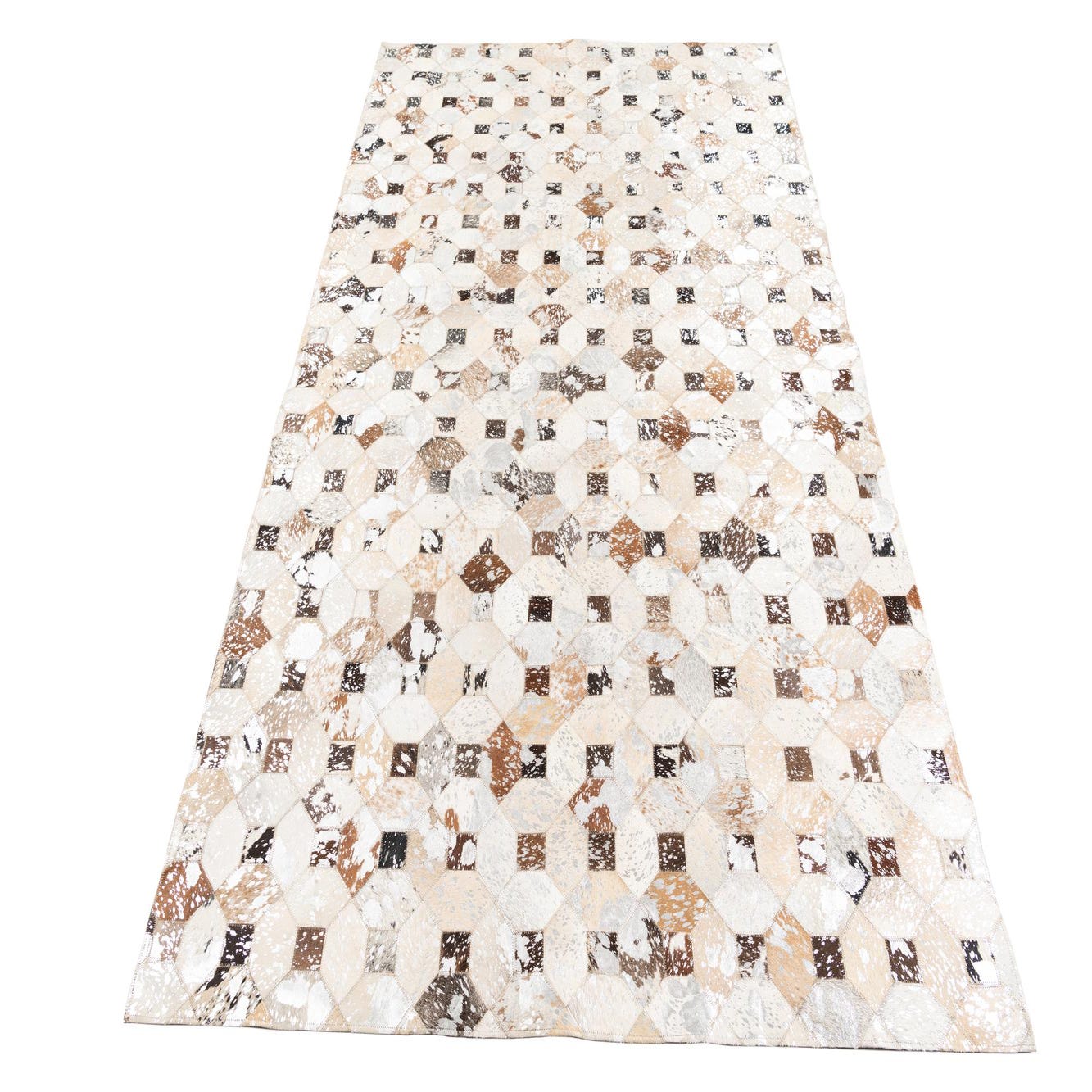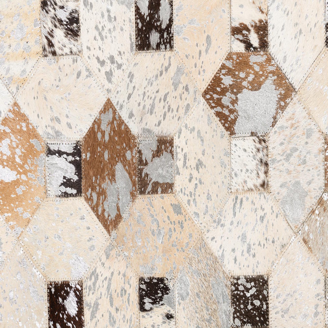 A 5x8 rectangular Cowhide Leather rug featuring a modern abstract patchwork of gray, silver, brown, and white cowhide pieces.