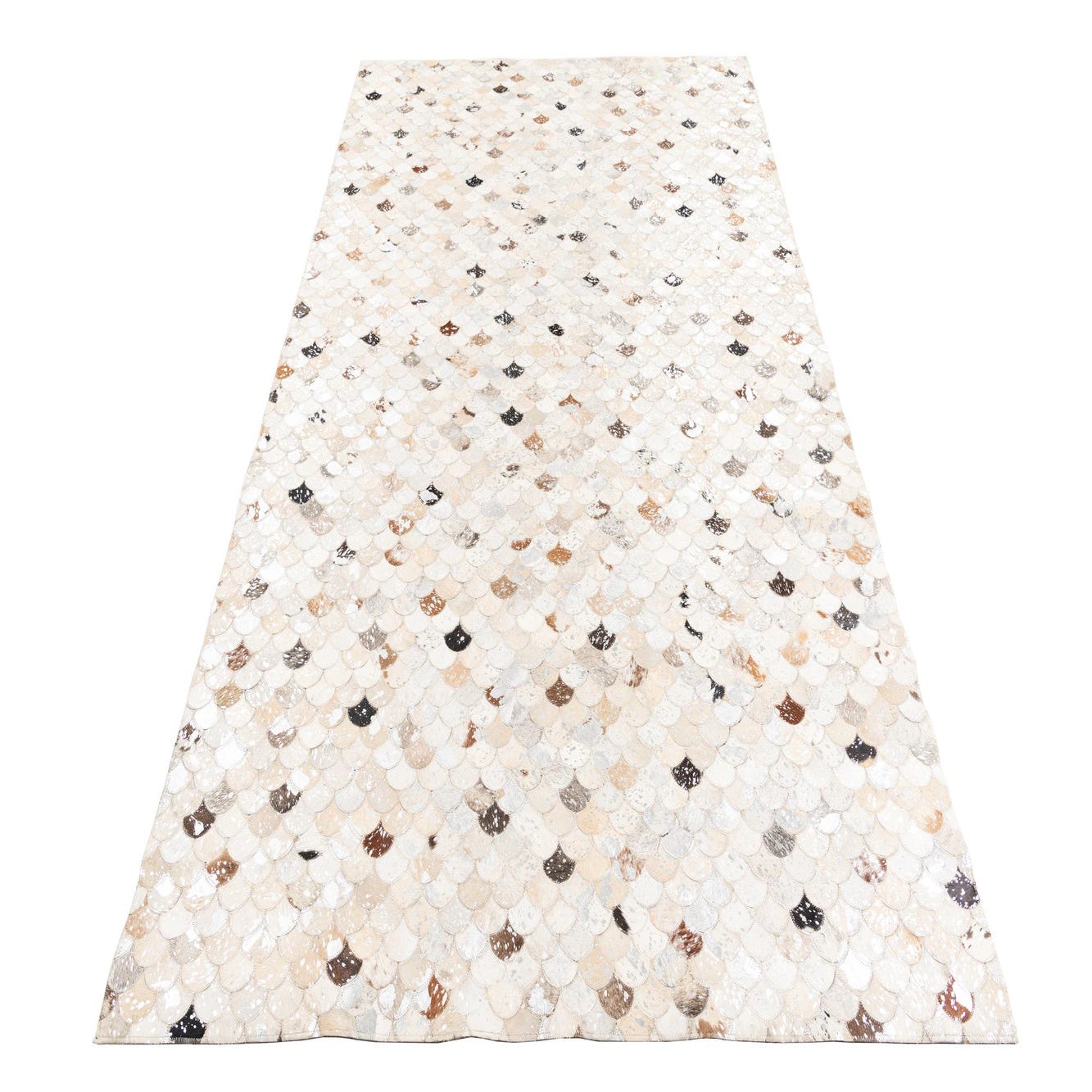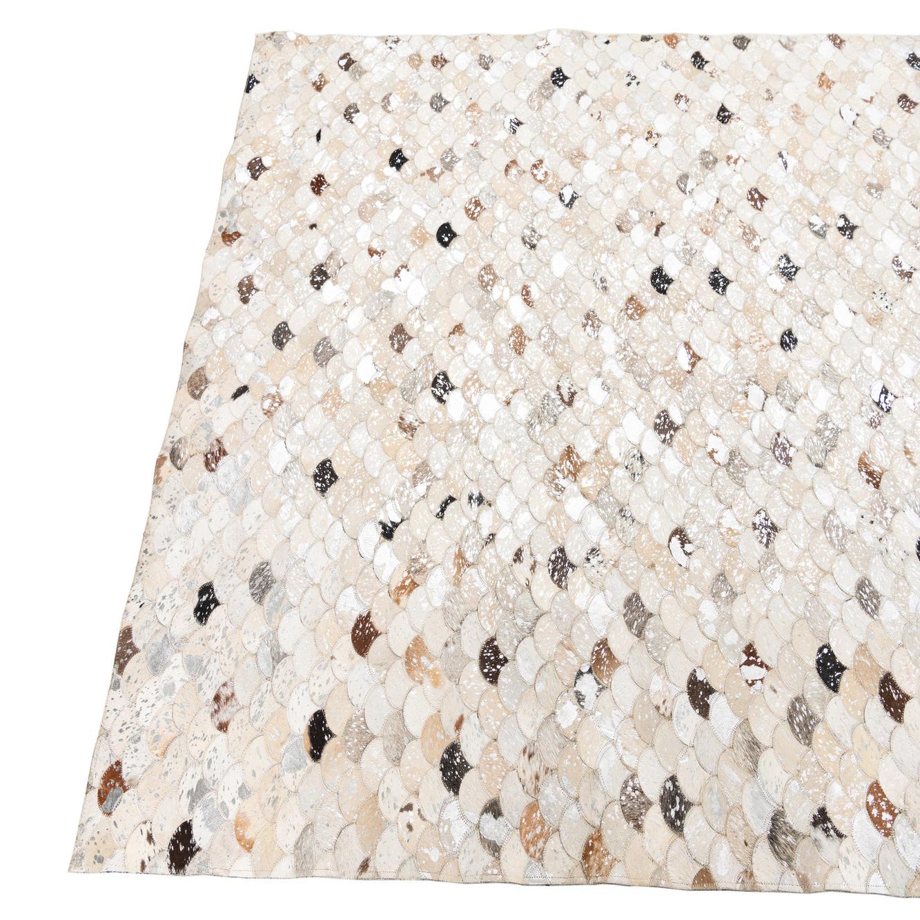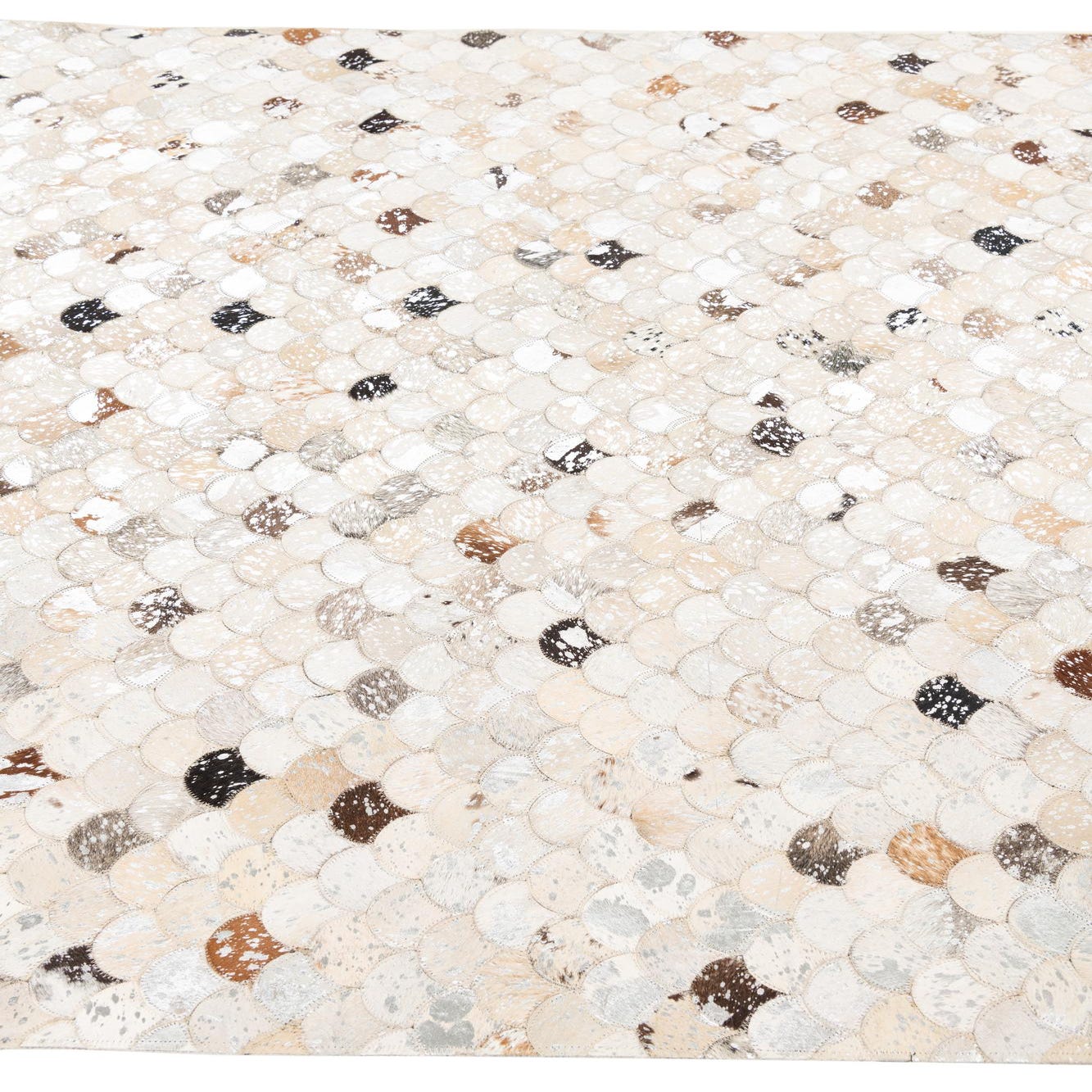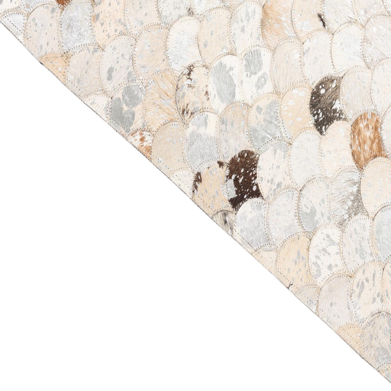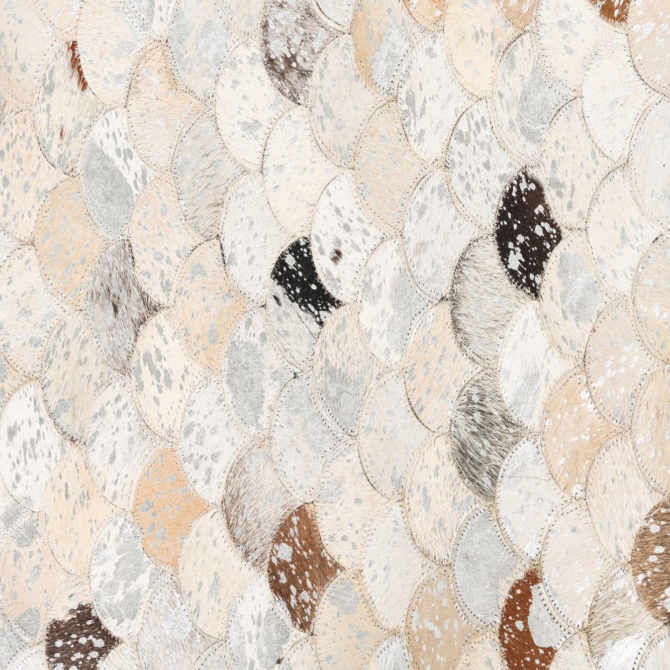 Hand made of cowhide and leather, this rug presents a scalloped patchwork pattern of small, overlapping semicircles that create a subtle, scale-like surface. The background is silver, while each patch carries natural variations in beige, cream, ivory, gray, light brown, brown and occasional black speckles. The artisanal assembly highlights tiny contrasts between pieces, producing a calm, organic rhythm across the field rather than a strict repeat.