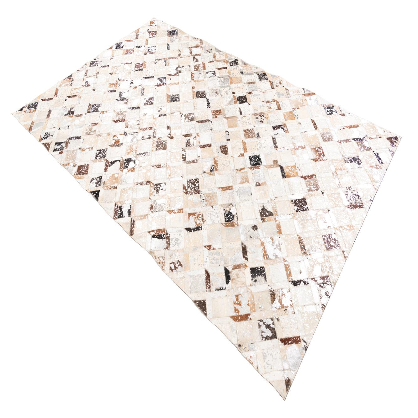 A 5x8 rectangular Cowhide Leather rug featuring a modern abstract patchwork of gray, silver, brown, and white diamond-shaped cowhide pieces.