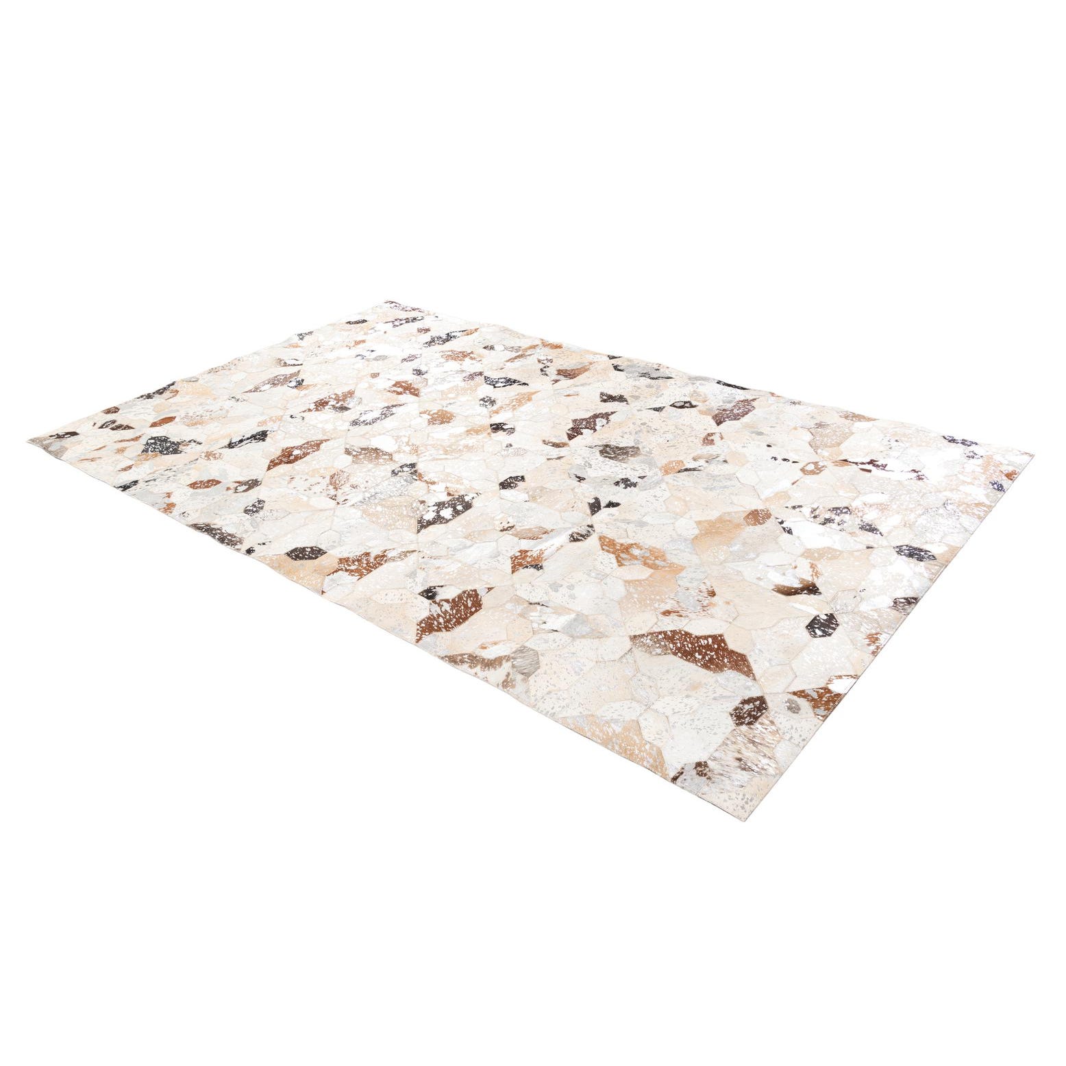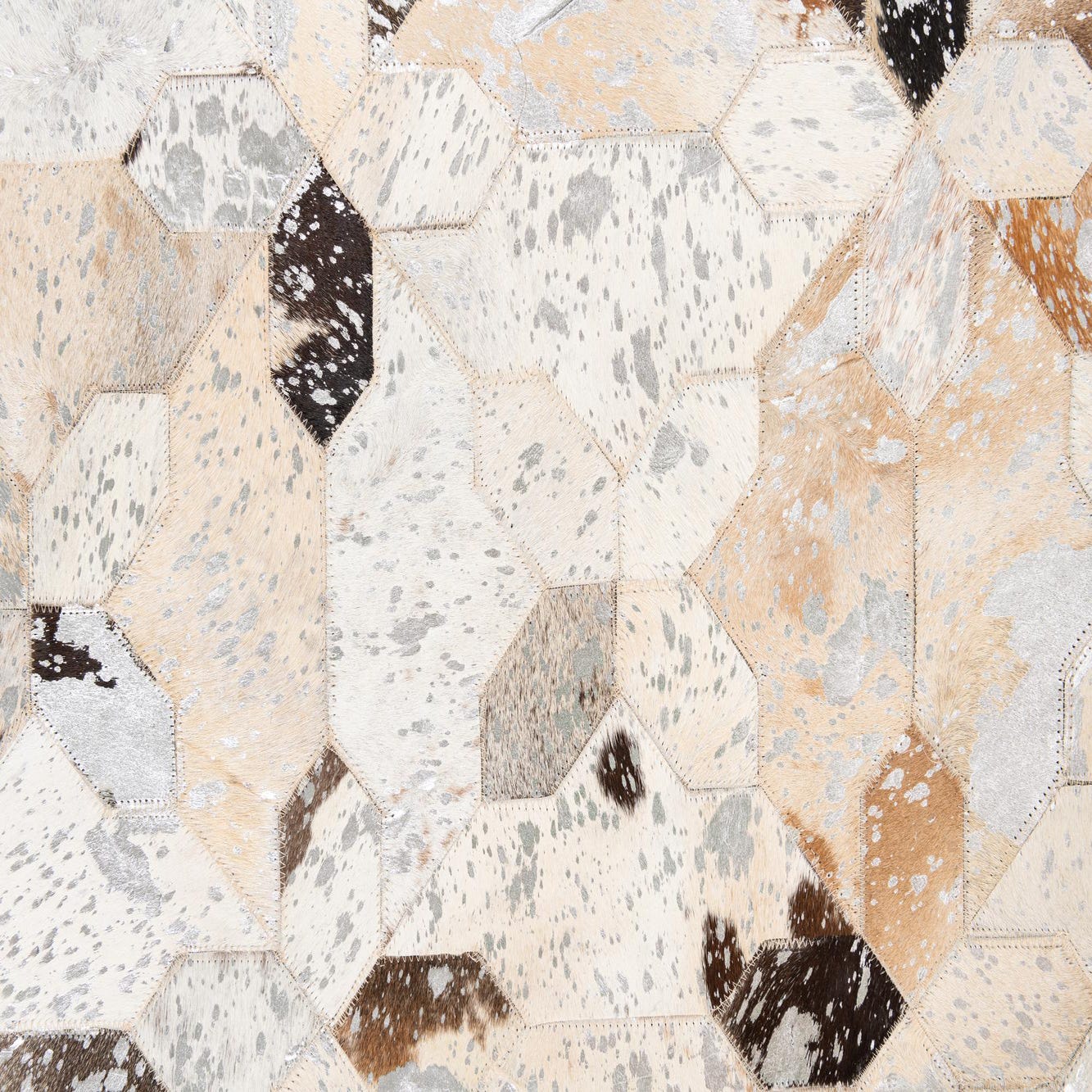 A 5x8 rectangular Cowhide Leather rug featuring a modern, abstract patchwork design in shades of gray, silver, and natural brown.