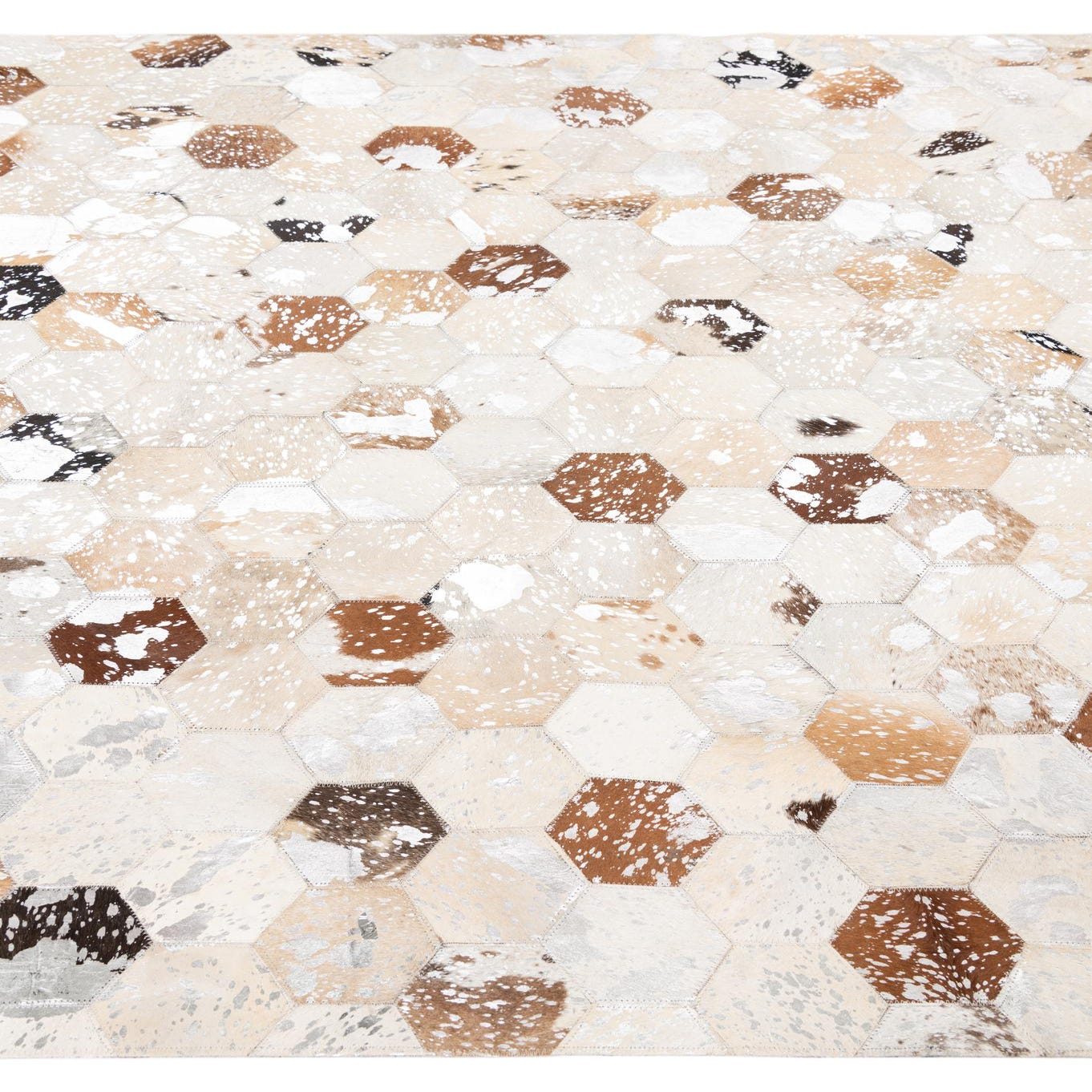 Hand made of cowhide and leather, this rug is constructed from a mosaic of small hexagonal patches that form a honeycomb-like pattern across a silver background. The surface mixes shades of beige, light brown, brown, gray, ivory and black, with natural speckles and markings on each hide adding subtle contrast and depth. Running your hand over it you notice the short hair of the cowhide and the cool, slightly glossy leather accents; the low-profile seams keep the overall feel mostly flat with gentle, organic texture.