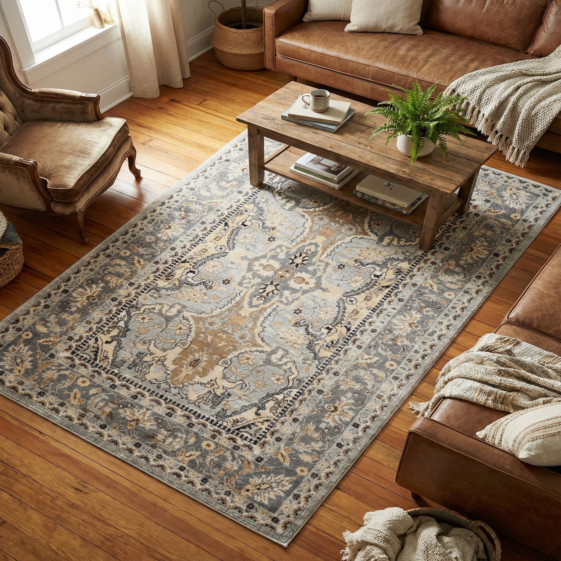 The neutral silver-and-gray base with warm tan highlights works across a range of interiors. Pair it with a light-gray sofa and a natural wood coffee table in a transitional living room, layer it under a bed to add a refined anchor to a calming bedroom palette, or use it in an entry or dining area where the ornamental border frames furniture. It complements cool metal finishes as well as warm woods and muted textiles for a balanced, lived-in look.