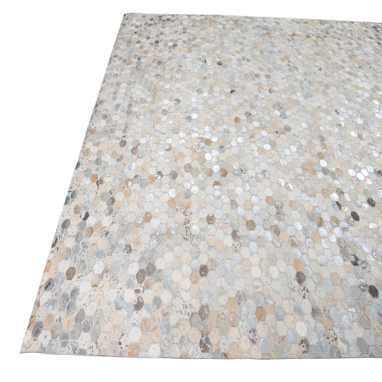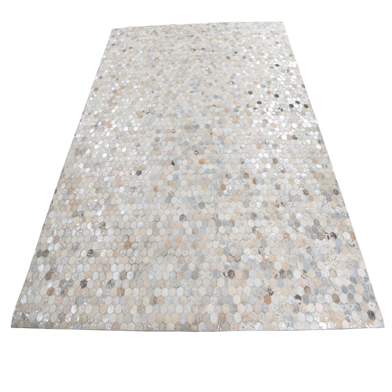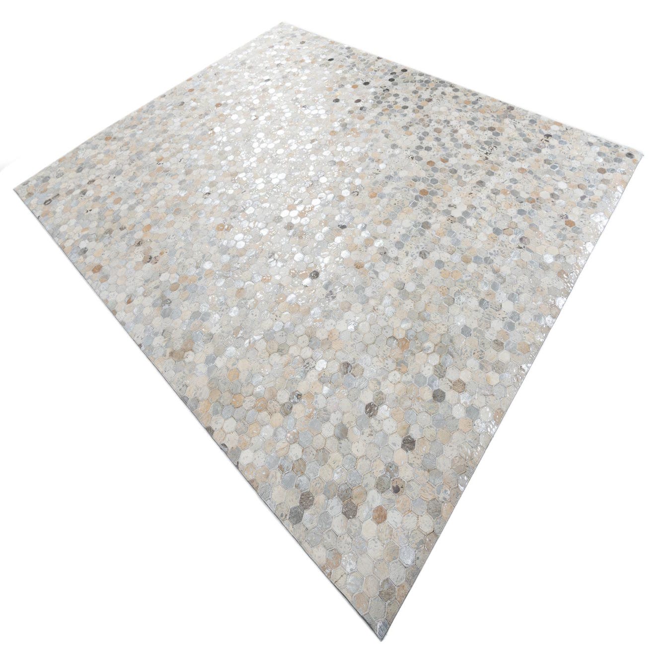 A rectangular 8x10 Cowhide Leather rug featuring a modern, abstract pattern of small hexagonal tiles in varying shades of gray, silver, and beige.