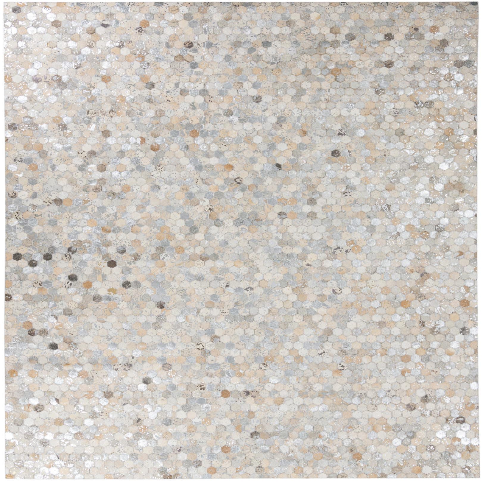 From our Cowhide Leather collection, this handcrafted 8x10 rug is meticulously made of cowhide and leather, offering a distinctive texture that is both durable and visually appealing. The rug's pattern is a mosaic of tones including silver, beige, brown, ivory, tan, and gray, set against a predominant silver background. Its natural color palette and unique textured surface provide an organic and sophisticated touch.