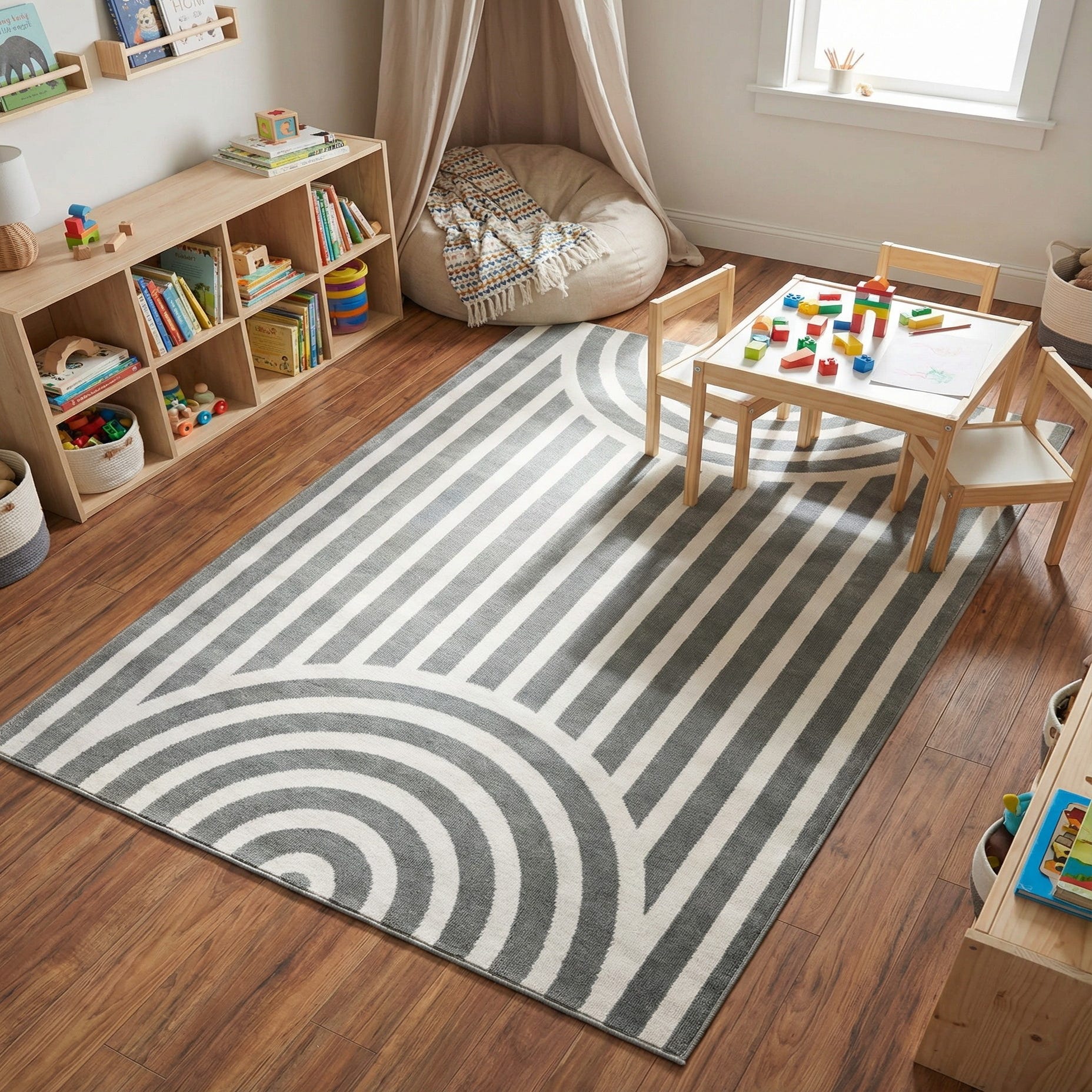 Well-suited to children's bedrooms, playrooms, or casual living areas, this rug brings structured graphic interest without competing with other patterns. Pair it with light wood furniture and soft textiles for a Scandinavian-inspired scheme, use it to define a reading nook or toy zone, or layer it over a neutral floor in a modern living room to add visual movement.