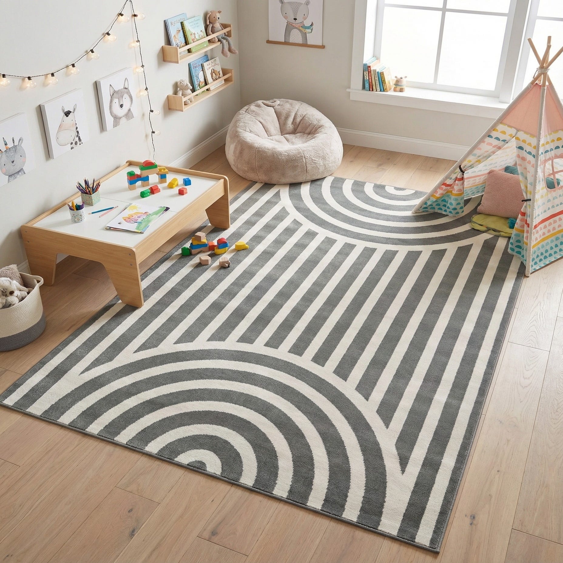 This rug works well in a variety of rooms: place it in a nursery or playroom to add a modern focal point without overwhelming colorful accessories, or use it in a contemporary living room or home office to define a seating area and introduce visual interest. The neutral Silver Gray and Ivory palette pairs easily with both muted and bright color schemes, making it a versatile choice for layered, modern interiors.