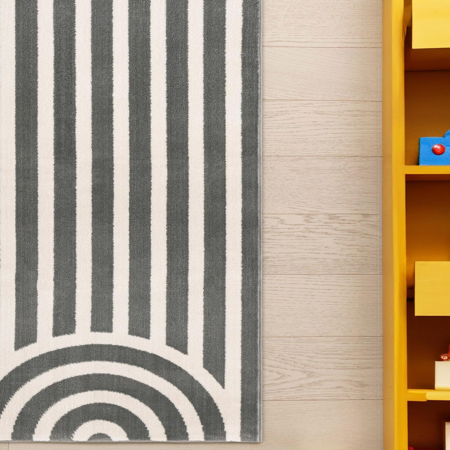 A 6 ft runner rug featuring a modern gray and white stripe pattern with a semi-circle design at each end, ideal for a hallway.