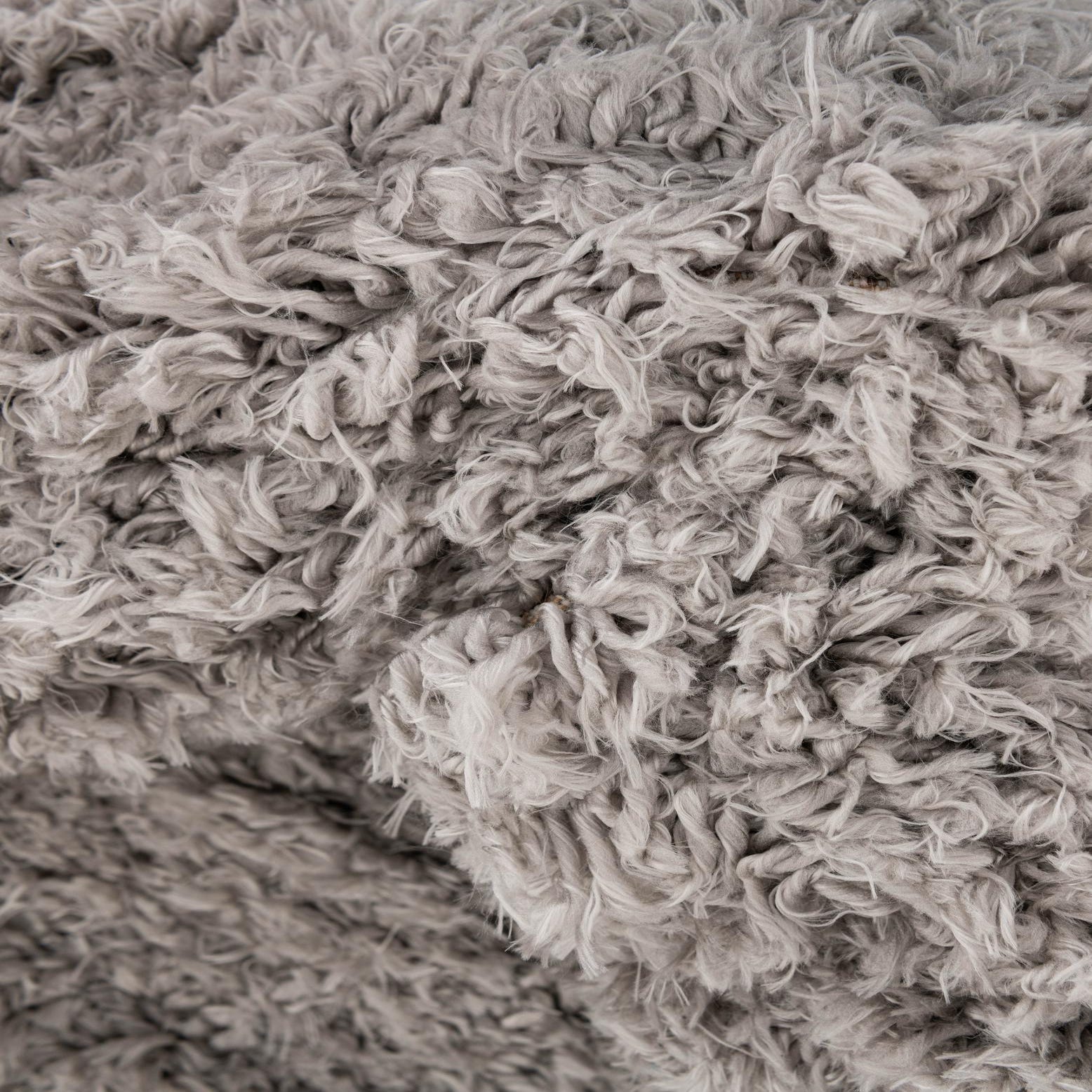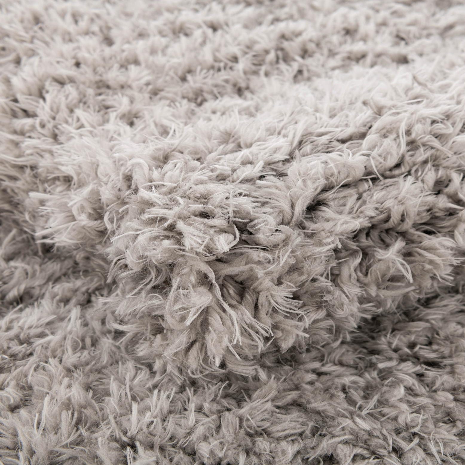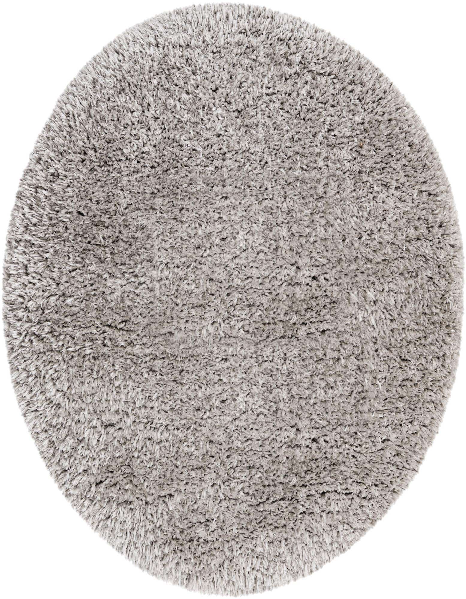 Plush, long-cut shag in a soft Silver Screen tone creates a calming, monochromatic surface with subtle tonal depth from the densely packed pile. The rug has no printed pattern—its interest comes from the plush texture and gentle movement of the fibers, which feel cushiony and warm underfoot. The round shape and uniform pile give it a simple, modern look that adds tactile softness to any floor.