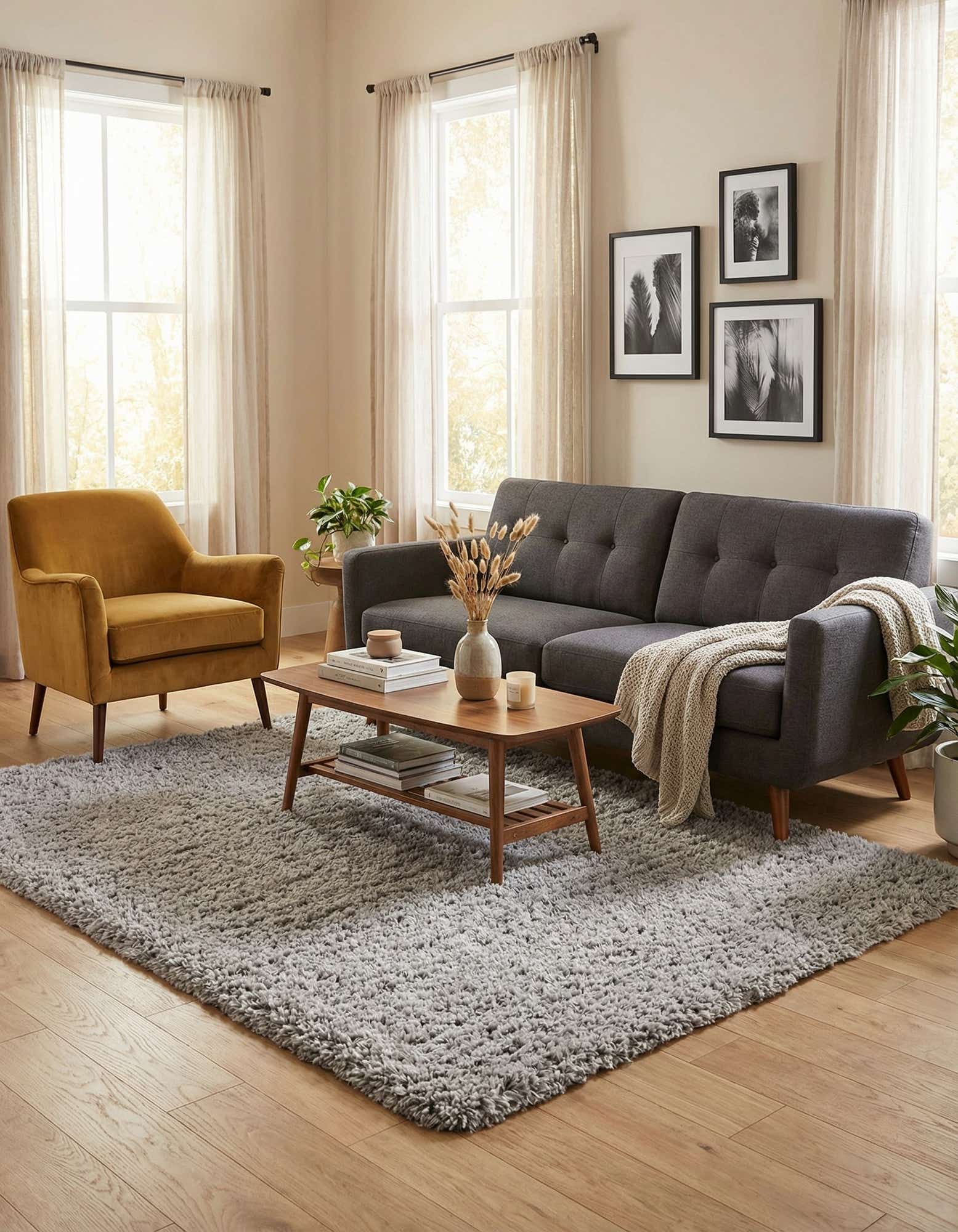 Machine-made from 100% polyester, the rug offers a consistent, full pile that layers easily over hardwood or tile. It works well in modern and transitional living rooms as a cozy foundation beneath seating groups, in bedrooms as a bedside or foot-of-bed layer, and in relaxed reading nooks where softness and warmth matter. The understated Silver Screen tone pairs neatly with cool neutrals, warm woods, or minimalist decor schemes.