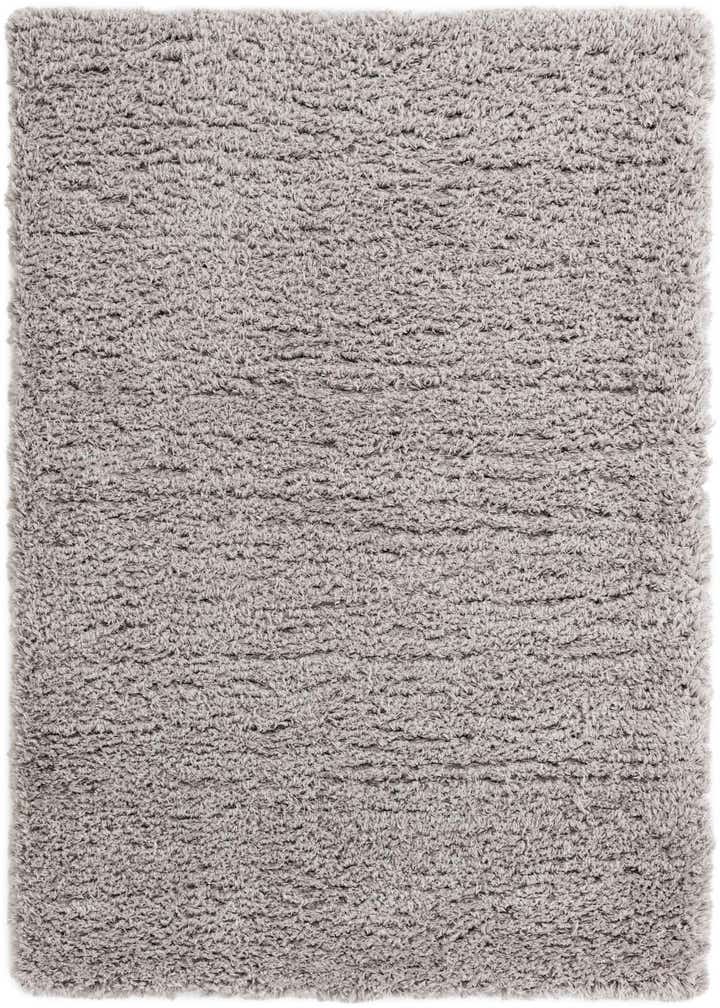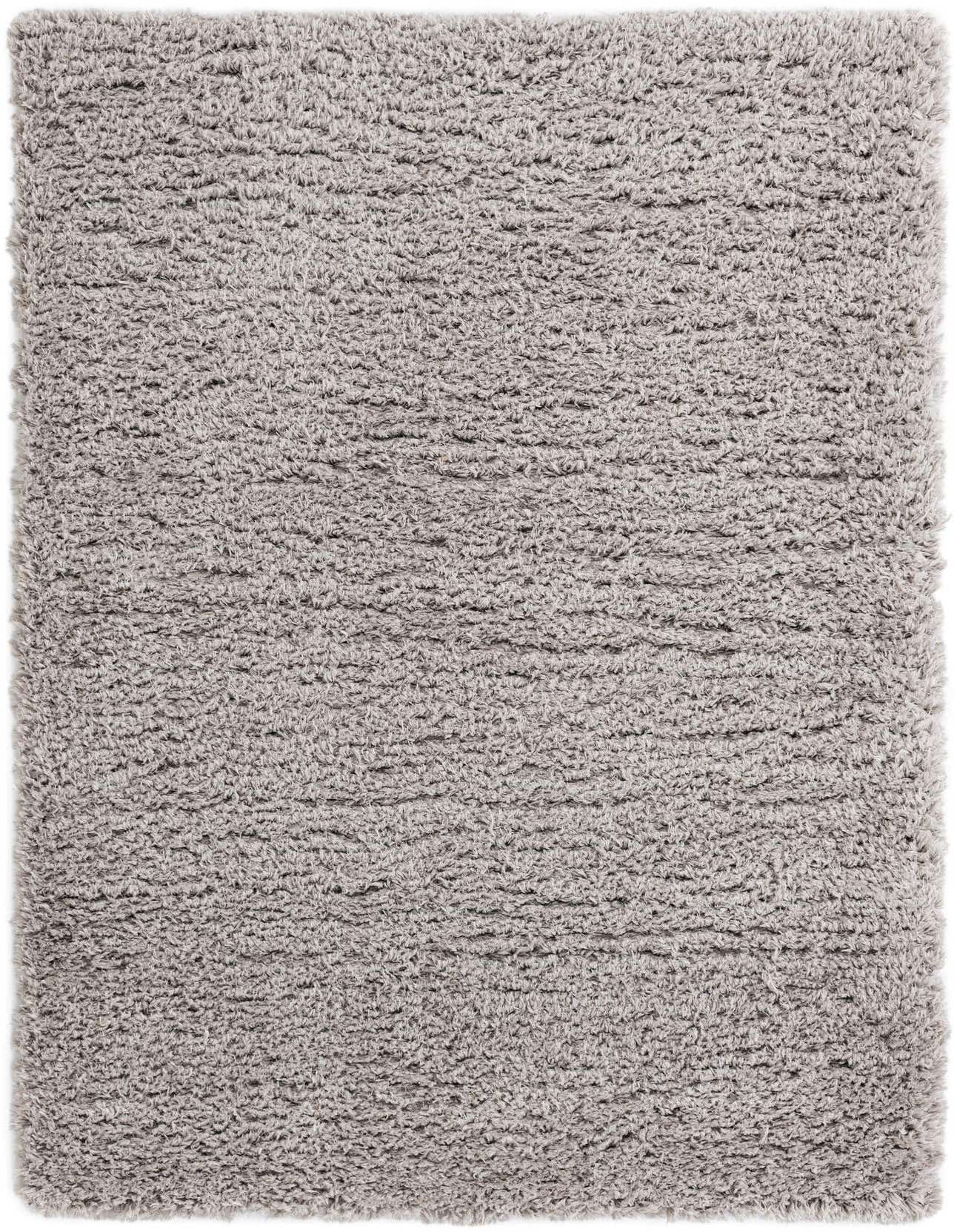 A soothing, silver-gray field called Silver Screen anchors this shag rug with a soft, tonal presence. The pile shows gentle, horizontal striations created by subtle variations in fiber height, giving the surface quiet texture without a bold pattern. The high-pile polyester feels thick and cushiony underfoot, with a plush, slightly lustrous finish that adds depth to the neutral color.