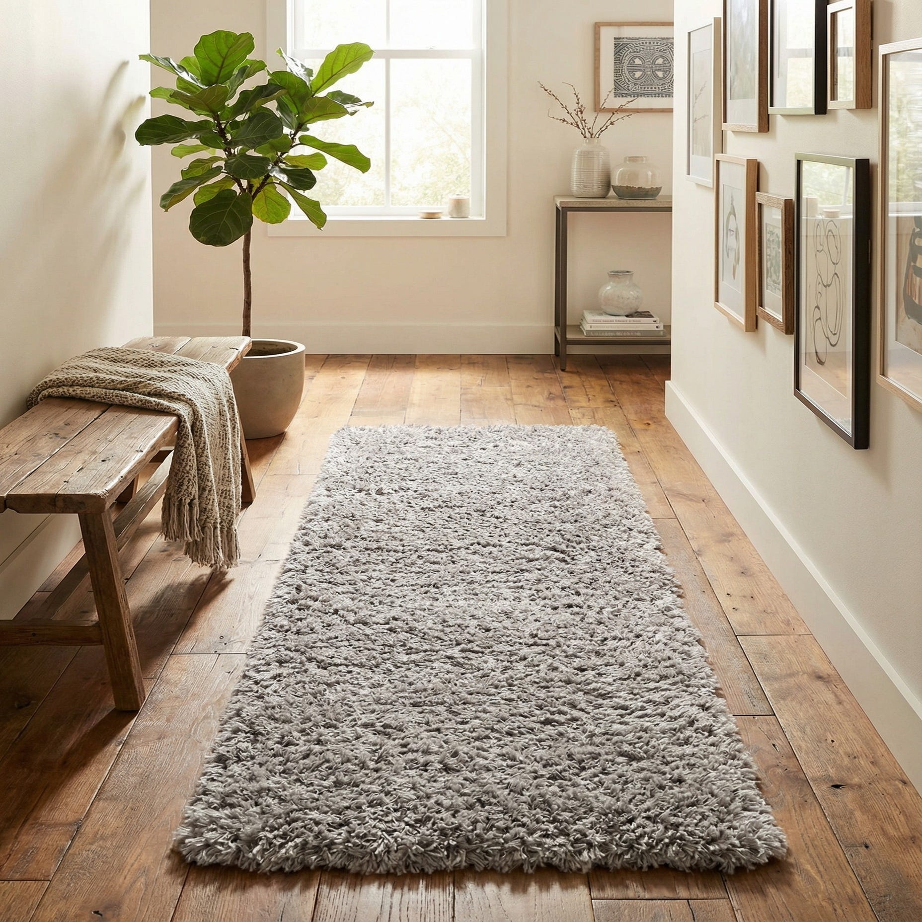 This runner works well in transitional and modern interiors where a neutral foundation is needed: place it along a hallway to soften hard flooring, beside a bed for a cozy morning step, or layered in front of a low-profile sofa to add texture without competing with patterned upholstery. Pair it with cool metals and glass for a streamlined look, or with warm wood tones and soft linens to balance its cool gray and add tactile contrast.