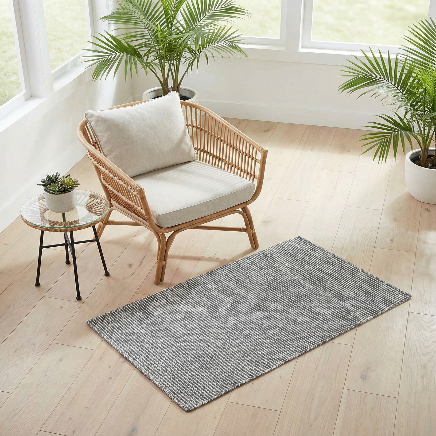 A 3x5 rectangular Jill Zarin Palm Springs Outdoor rug in Silver Stars, featuring a modern textured pattern of alternating light and dark grey horizontal stripes.