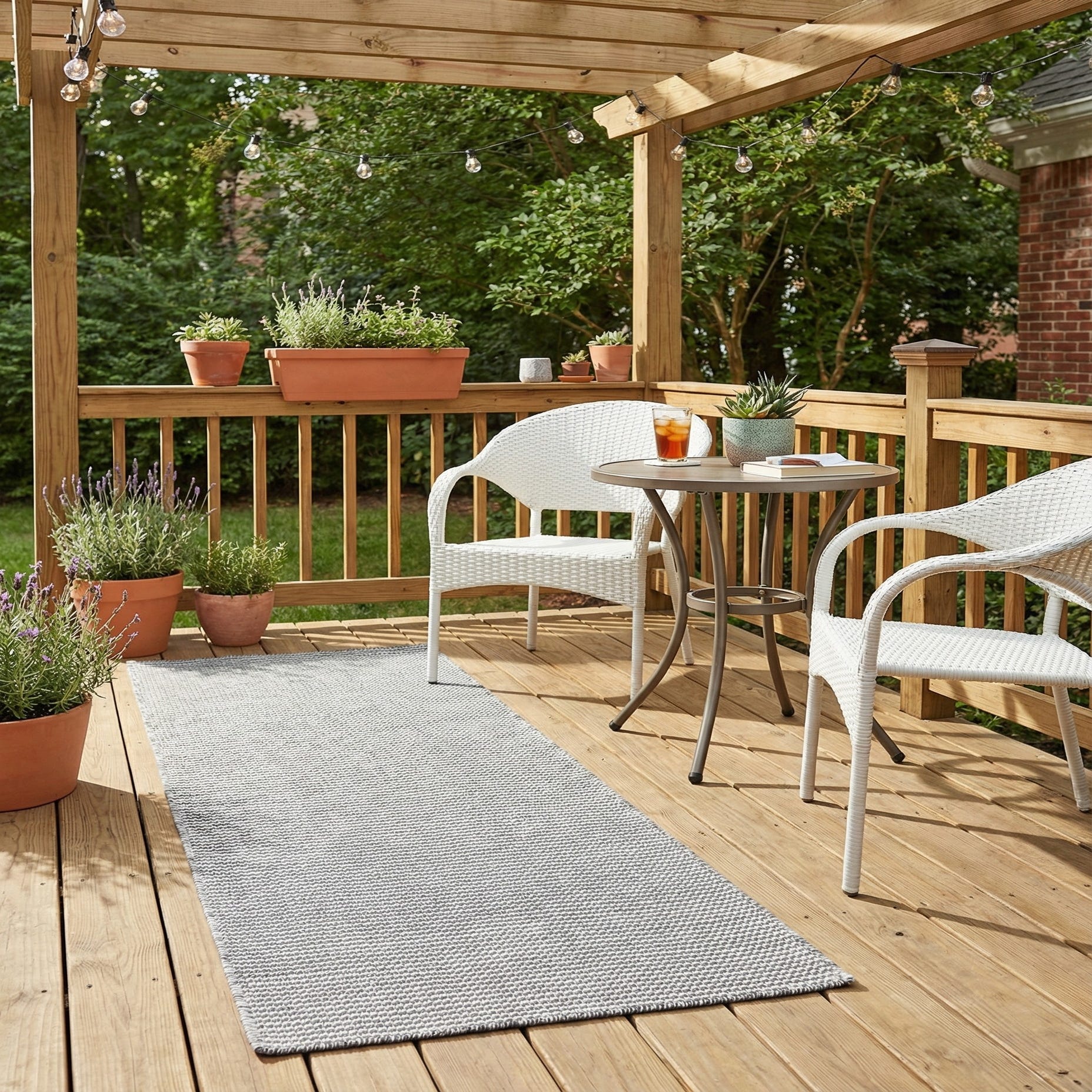 A 6 ft runner rug from the Jill Zarin Palm Springs Outdoor collection, featuring a modern silver stars pattern with a textured flatweave.