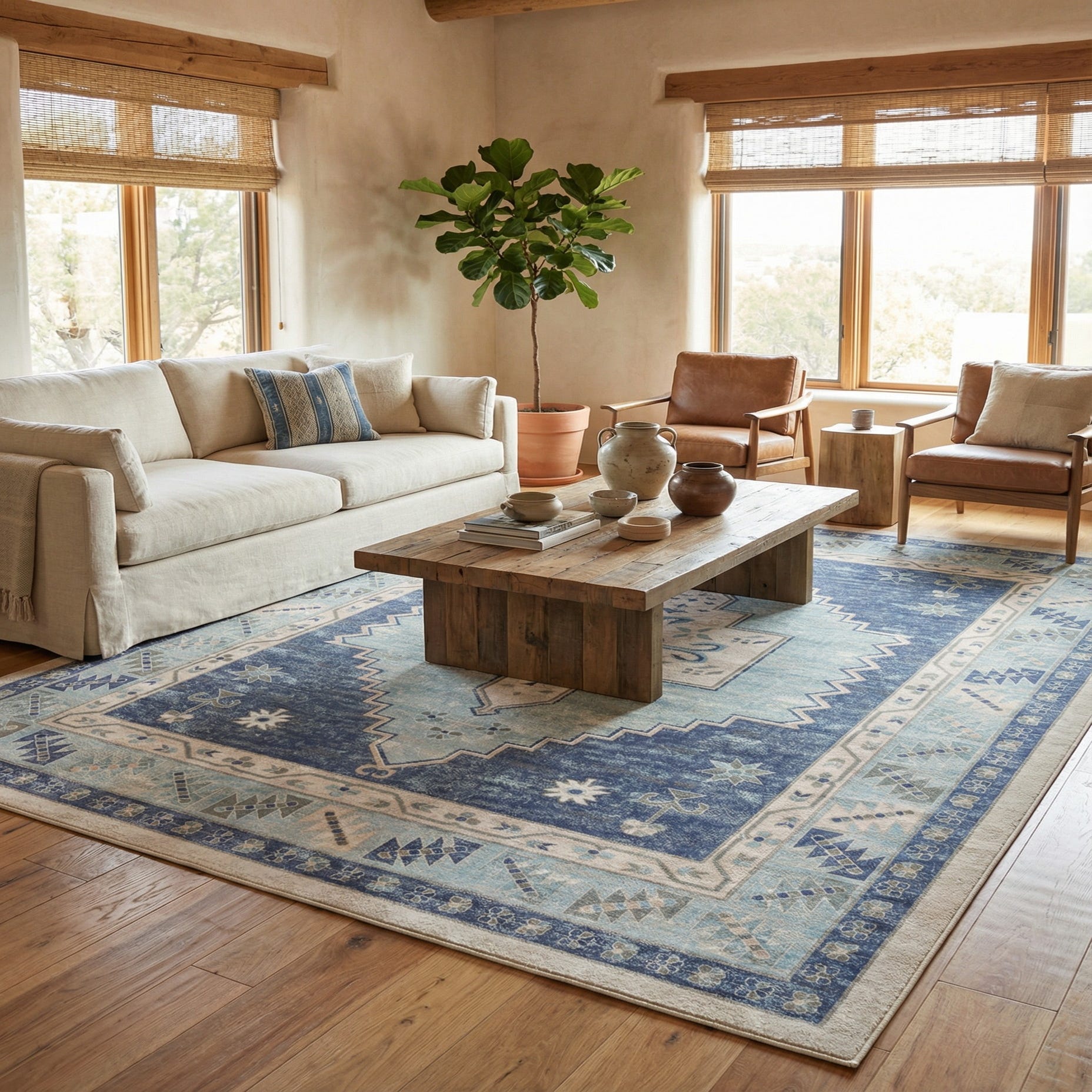 This palette and pattern work well in coastal, transitional, or relaxed contemporary interiors. Place it to anchor a seating group in the living room, beneath a dining table for a softer foundation, or under the bed to introduce cool, airy hues to a bedroom. Pair it with light woods, linen upholstery, neutral woven textures, and matte metal accents to complement the sky blue background and the rug’s muted beige, ivory, gray, and light blue tones.