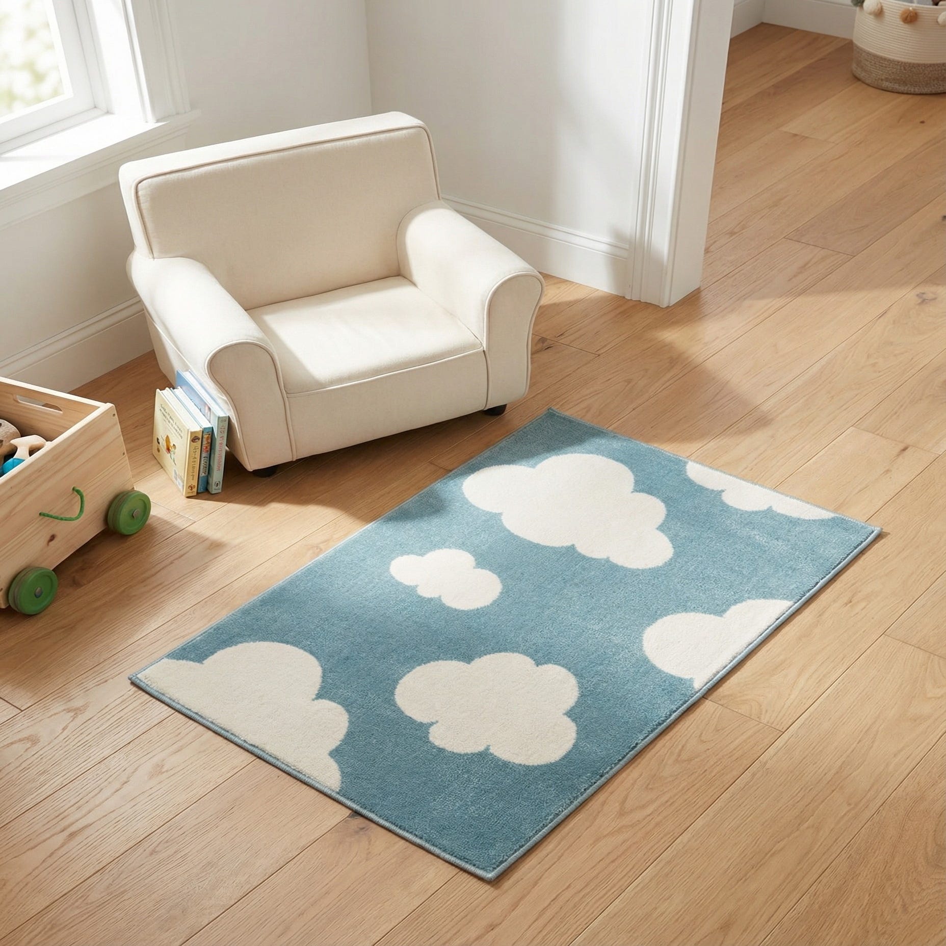 Primary color is Sky blue. Colors in this rug include: Sky blue, Ivory.