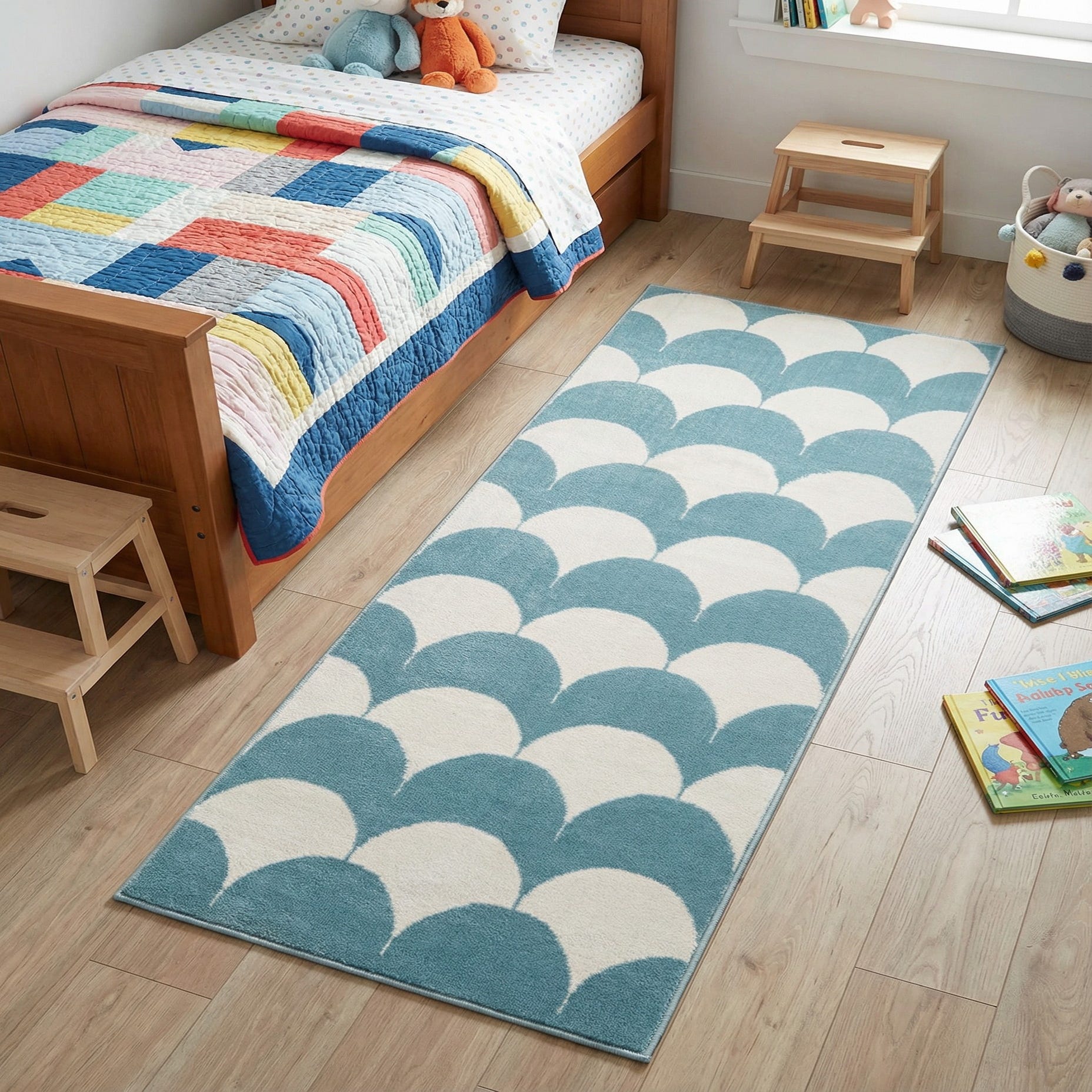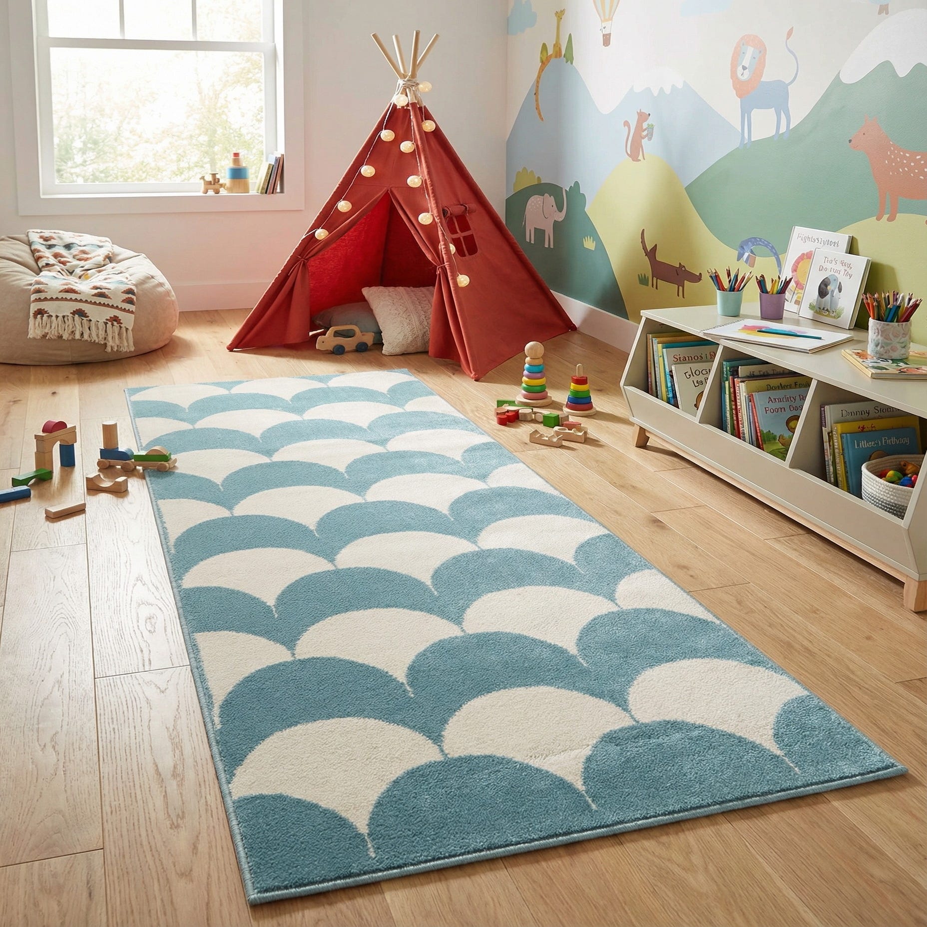 Primary color is Sky blue. Colors in this rug include: Sky blue, Ivory.
