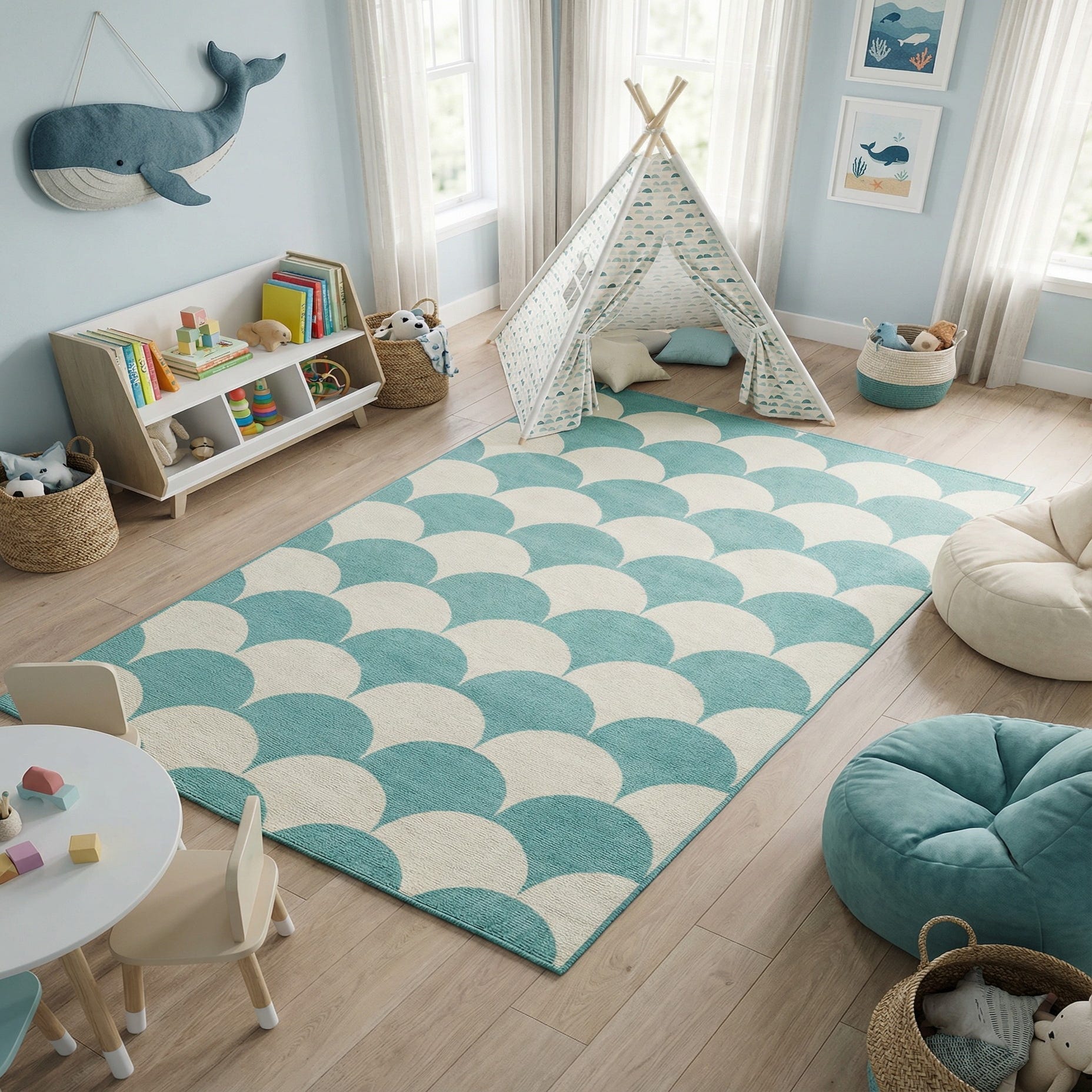 Primary color is Sky blue. Colors in this rug include: Sky blue, Ivory.