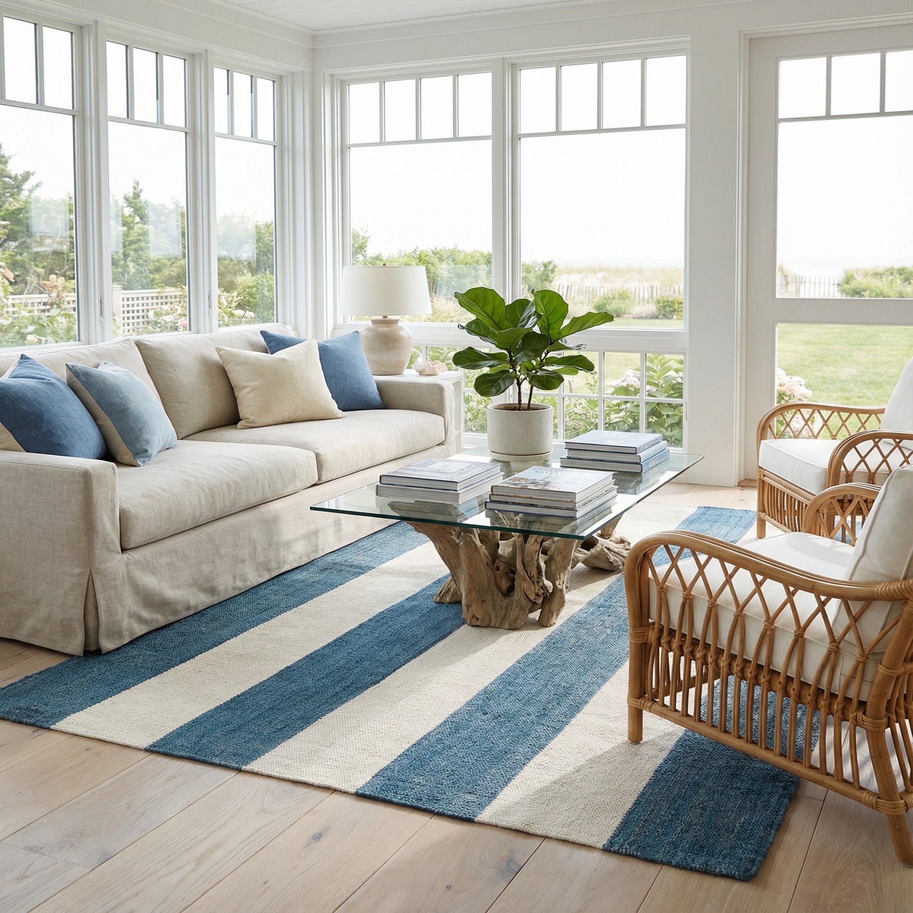 The sky blue background is accented with ivory stripes, creating a visual contrast that is both striking and pleasantly simplistic. The natural materials used ensure a touch of organic texture, enhancing various decor themes from contemporary to coastal, or even minimalist interiors. Whether placed in a living room, dining area, or home office, this rug's clean lines and calming hues will complement natural light and open spaces, making it a versatile addition to any home.