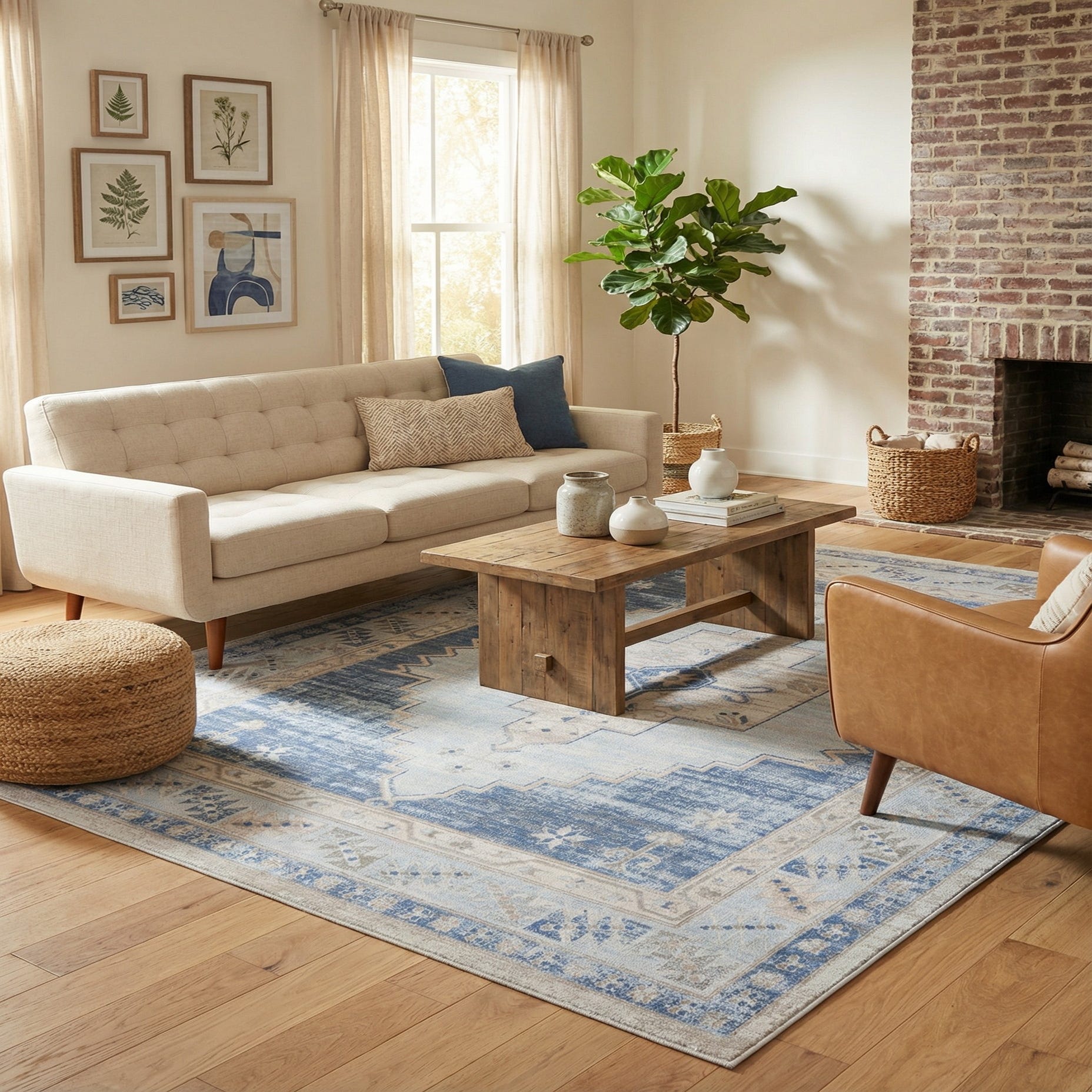 Machine made of 100% polypropylene, the rug has a low, dense pile that feels smooth underfoot and presents the pattern with clear definition. Pair it with a light-gray sofa and natural wood coffee table for a relaxed living room, layer it beneath a linen-upholstered bed with rattan or wicker accents in a coastal or farmhouse bedroom, or use it to ground a dining room with whitewashed chairs and brass lighting. The soft blues and warm neutrals make it an adaptable choice for spaces that favor a tranquil, collected look.