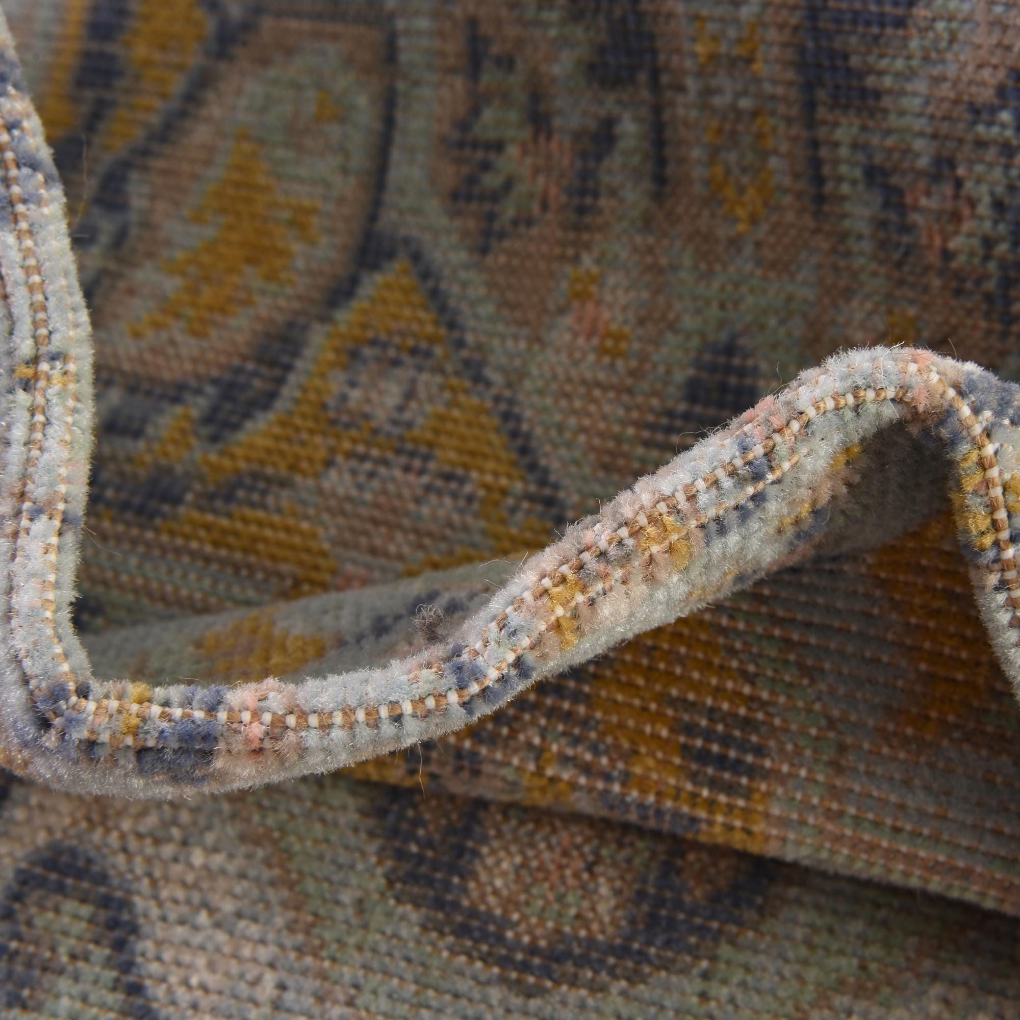 Works well where shape and color can be a focal point: place it beneath a round dining table or in a foyer to echo architectural angles, use it to anchor a seating group in a coastal or cottage-style living room, or layer it under a small breakfast nook table for added pattern and warmth. The soft blues and gold accents pair nicely with light woods, painted white or gray cabinetry, and brass or aged-metal hardware for a relaxed, polished look.