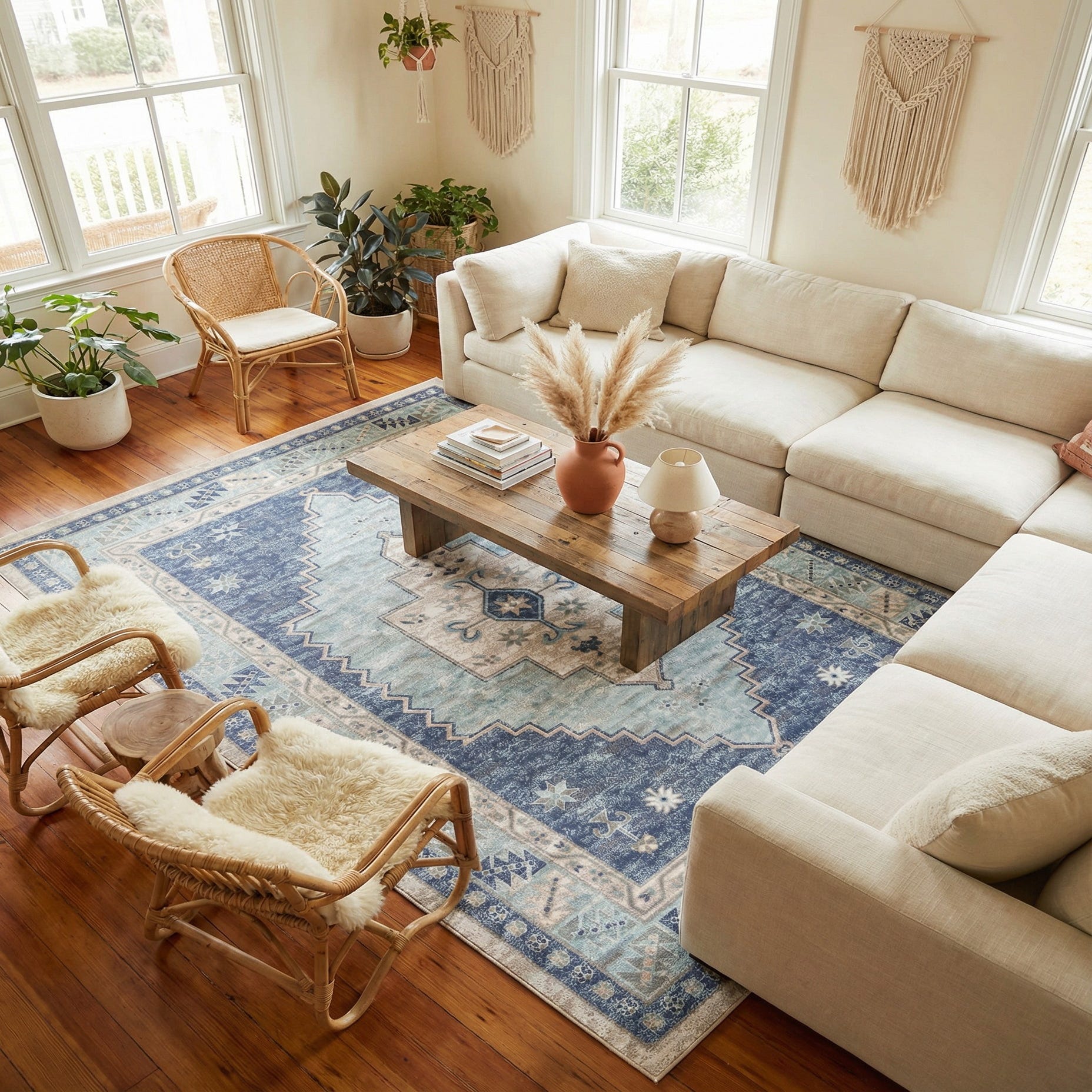 Woven from 100% polypropylene, the rug has a low-profile pile with a smooth, slightly dense hand that feels comfortable underfoot while keeping a neat, tailored appearance. Its palette and pattern work well in coastal or cottage-inspired living rooms, a serene bedroom layered under the bed, or a light, modern-traditional dining area where the medallion can center a seating grouping. The soft blues and neutrals make it an easy anchor for pale woods, linen upholstery, and brass or matte-finish metals.